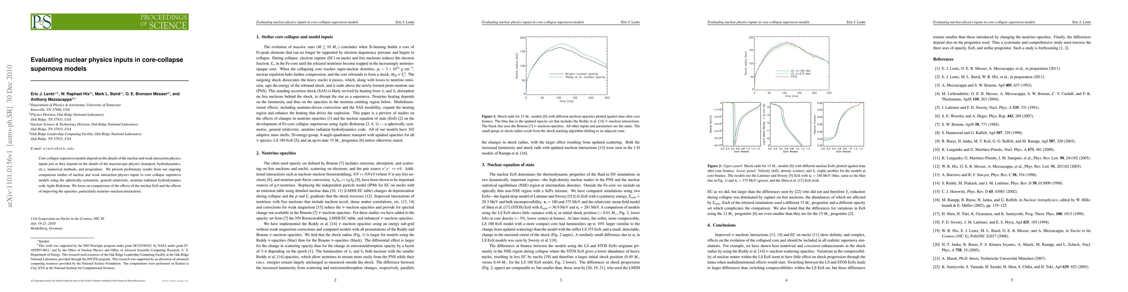 This paper evaluates the impact of nuclear and weak interaction physics inputs on core-collapse supernova models, using the Agile-Boltztran code. Preliminary results focus on the effects of the nuclear equation of state and improved neutrino-nucleon interaction opacities.