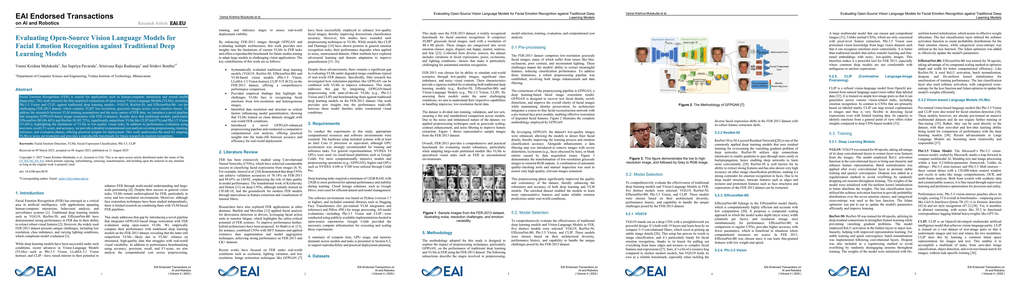 This study compares open-source Vision-Language Models (VLMs) to traditional deep learning models for Facial Emotion Recognition (FER) using the FER-2013 dataset. Traditional models, especially EfficientNet-B0 and ResNet-50, significantly outperformed VLMs, indicating VLMs' limitations in low-quality visual tasks. The research also provides a detailed computational cost analysis and serves as a benchmark for future emotion recognition research.