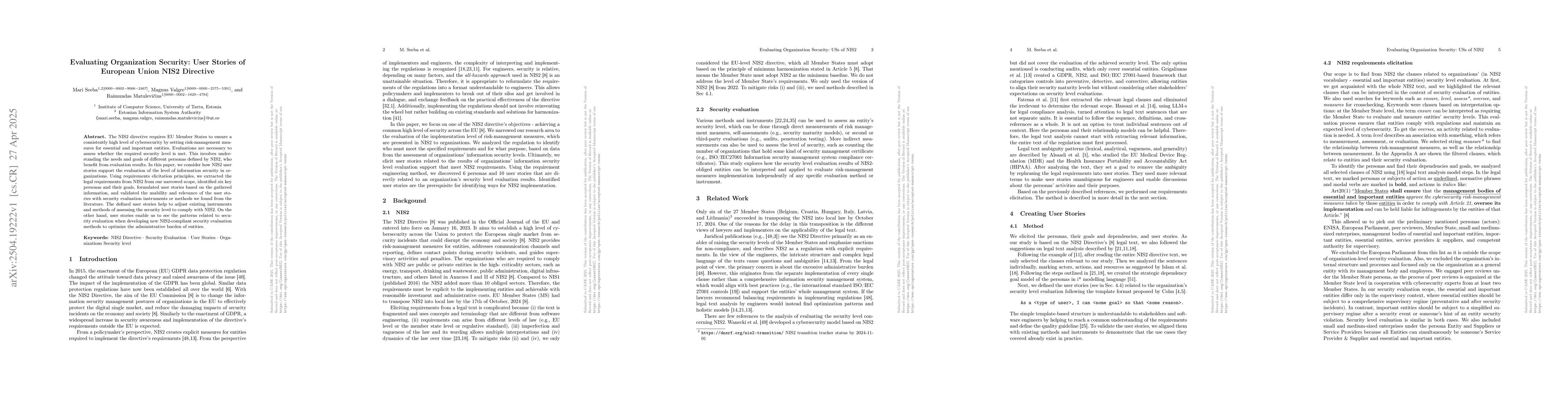 The research utilized requirements elicitation principles to extract legal requirements from the NIS2 directive, identified six key personas and their goals, and formulated user stories for evaluating cybersecurity levels in organizations. Validation of user stories' usability and relevance was done using existing security evaluation instruments.