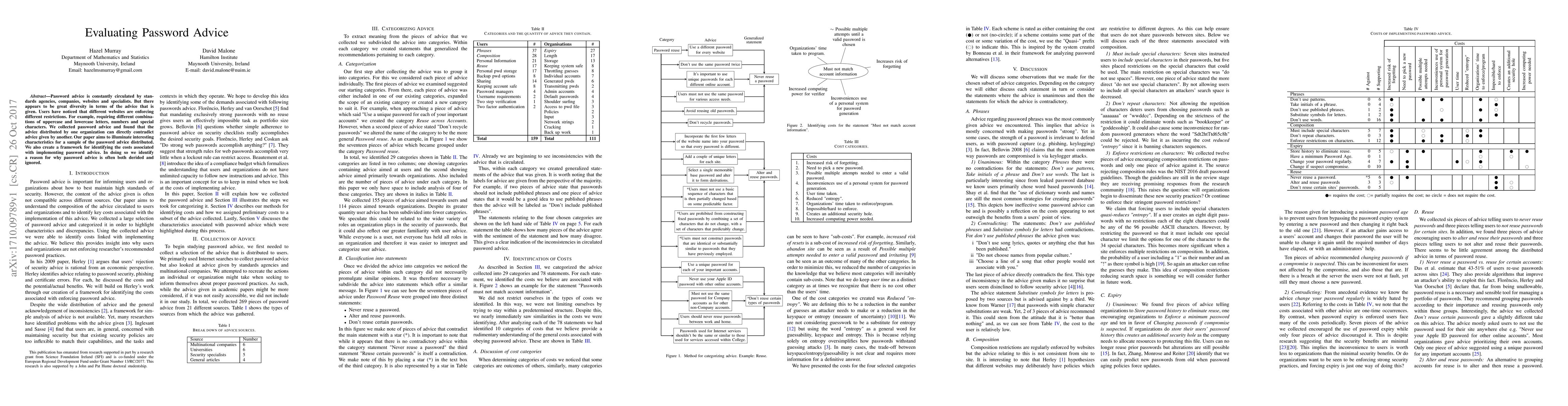 Password advice is constantly circulated by standards agencies, companies, websites and specialists. But there appears to be great diversity in terms of the advice that is given. Users have noticed that different websites are enforcing different restrictions. For example, requiring different combinations of uppercase and lowercase letters, numbers and special characters. We collected password advice and found that the advice distributed by one organization can directly contradict advice given by another. Our paper aims to illuminate interesting characteristics for a sample of the password advice distributed. We also create a framework for identifying the costs associated with implementing password advice. In doing so we identify a reason for why password advice is often both derided and ignored.