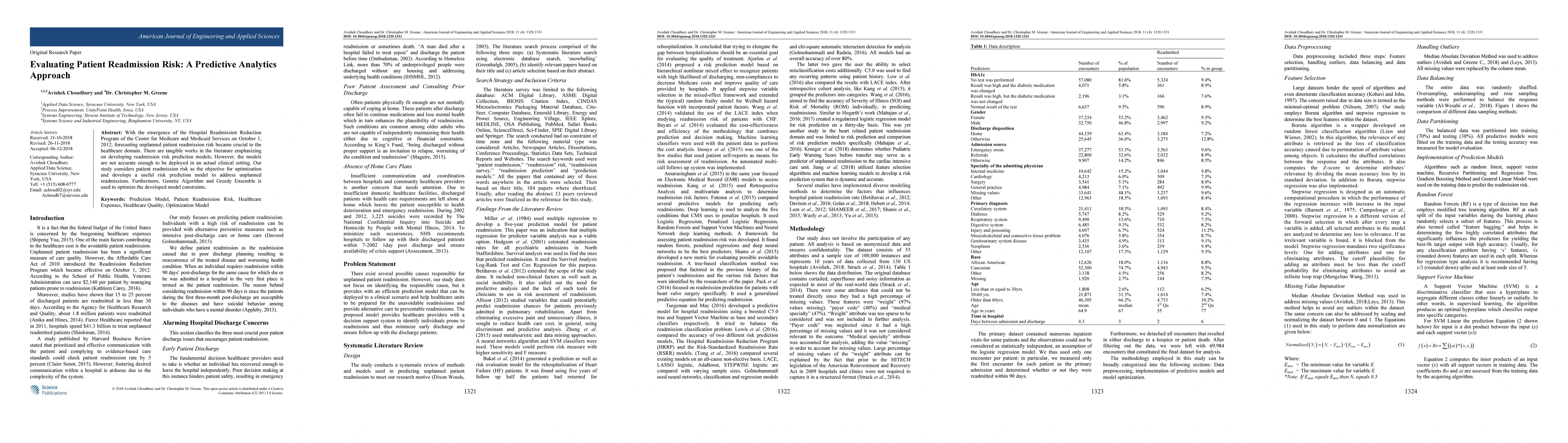 This study develops a predictive analytics model for forecasting unplanned patient readmissions, aiming to improve the accuracy of existing readmission risk prediction models. The model is optimized using a Genetic Algorithm and Greedy Ensemble to enhance its practical deployment in clinical settings.