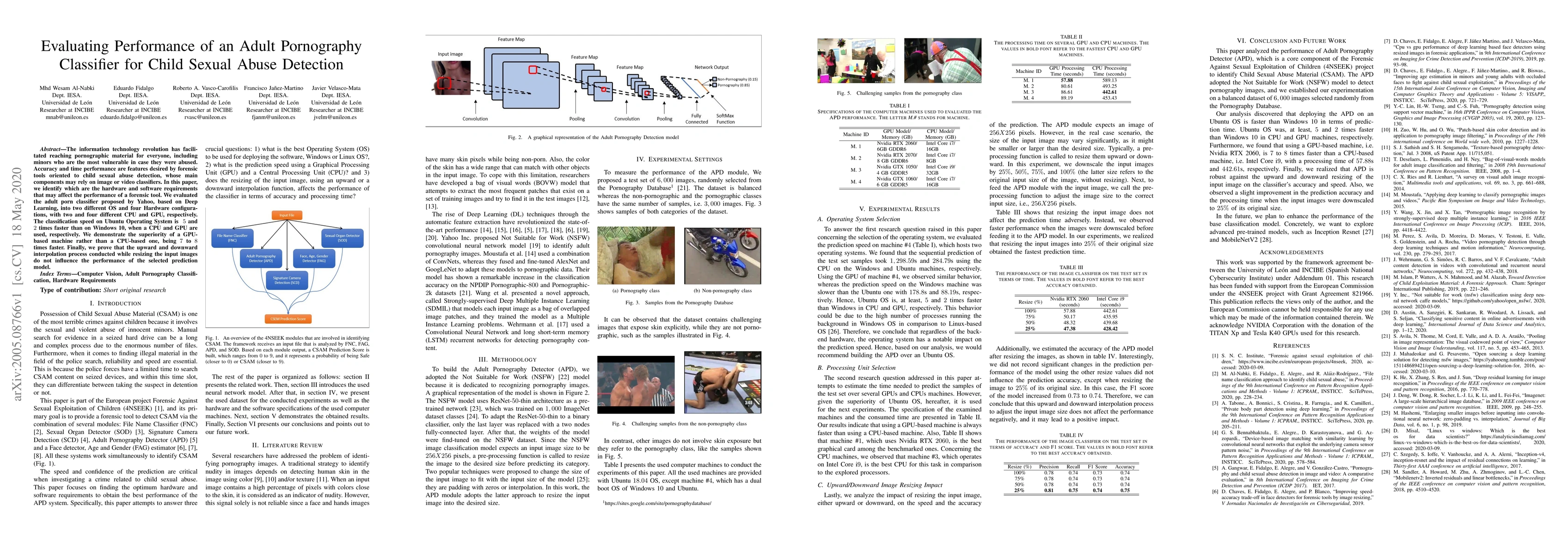 This paper evaluates the performance of a Deep Learning-based adult pornography classifier for detecting child sexual abuse, testing it across different OS and hardware configurations. Results show that GPU-based systems are significantly faster than CPU-based ones, with the best performance on Ubuntu OS.
