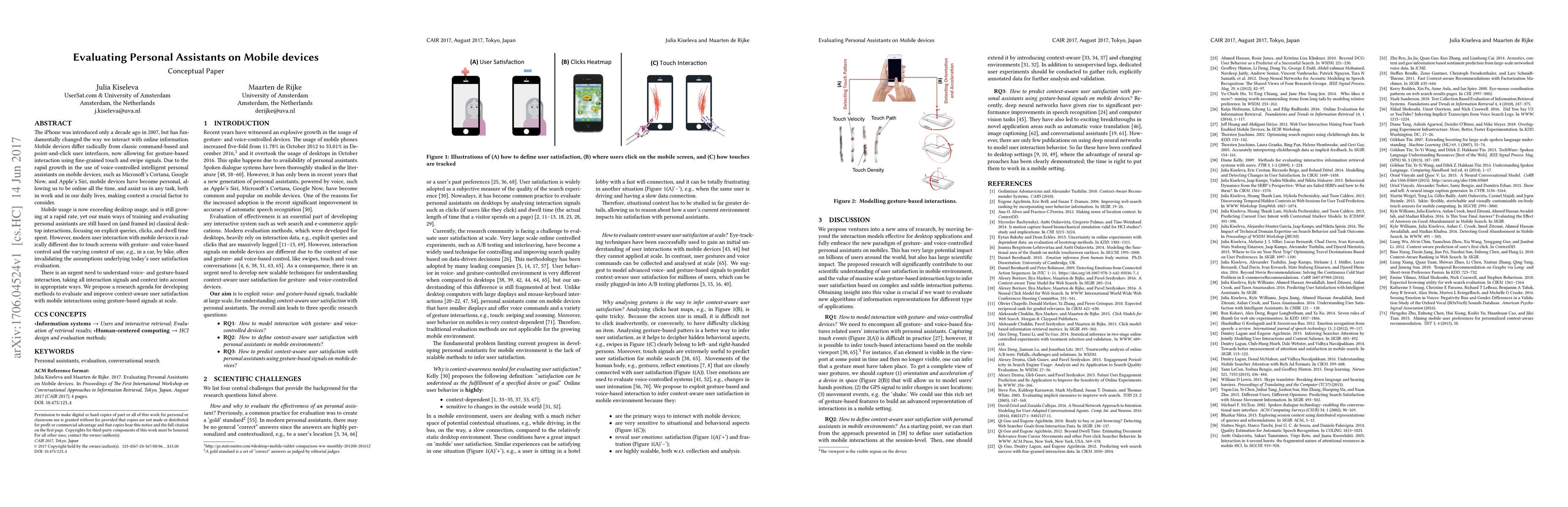 The iPhone was introduced only a decade ago in 2007 but has fundamentally changed the way we interact with online information. Mobile devices differ radically from classic command-based and point-and-click user interfaces, now allowing for gesture-based interaction using fine-grained touch and swipe signals. Due to the rapid growth in the use of voice-controlled intelligent personal assistants on mobile devices, such as Microsoft's Cortana, Google Now, and Apple's Siri, mobile devices have become personal, allowing us to be online all the time, and assist us in any task, both in work and in our daily lives, making context a crucial factor to consider. Mobile usage is now exceeding desktop usage, and is still growing at a rapid rate, yet our main ways of training and evaluating personal assistants are still based on (and framed in) classical desktop interactions, focusing on explicit queries, clicks, and dwell time spent. However, modern user interaction with mobile devices is radically different due to touch screens with a gesture- and voice-based control and the varying context of use, e.g., in a car, by bike, often invalidating the assumptions underlying today's user satisfaction evaluation. There is an urgent need to understand voice- and gesture-based interaction, taking all interaction signals and context into account in appropriate ways. We propose a research agenda for developing methods to evaluate and improve context-aware user satisfaction with mobile interactions using gesture-based signals at scale.