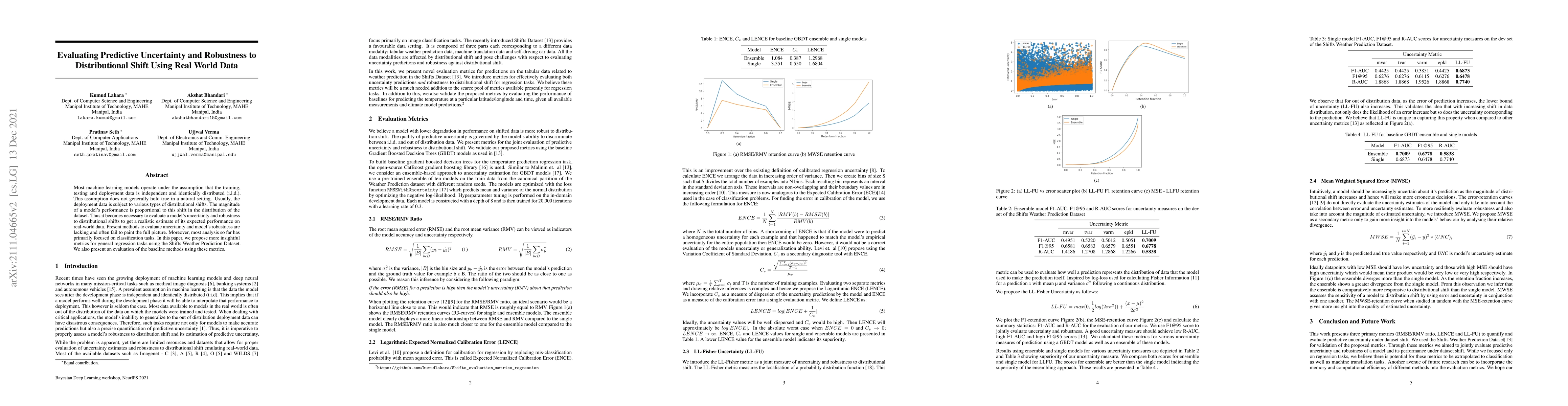 Most machine learning models operate under the assumption that the training, testing and deployment data is independent and identically distributed (i.i.d.). This assumption doesn't generally hold true in a natural setting. Usually, the deployment data is subject to various types of distributional shifts. The magnitude of a model's performance is proportional to this shift in the distribution of the dataset. Thus it becomes necessary to evaluate a model's uncertainty and robustness to distributional shifts to get a realistic estimate of its expected performance on real-world data. Present methods to evaluate uncertainty and model's robustness are lacking and often fail to paint the full picture. Moreover, most analysis so far has primarily focused on classification tasks. In this paper, we propose more insightful metrics for general regression tasks using the Shifts Weather Prediction Dataset. We also present an evaluation of the baseline methods using these metrics.