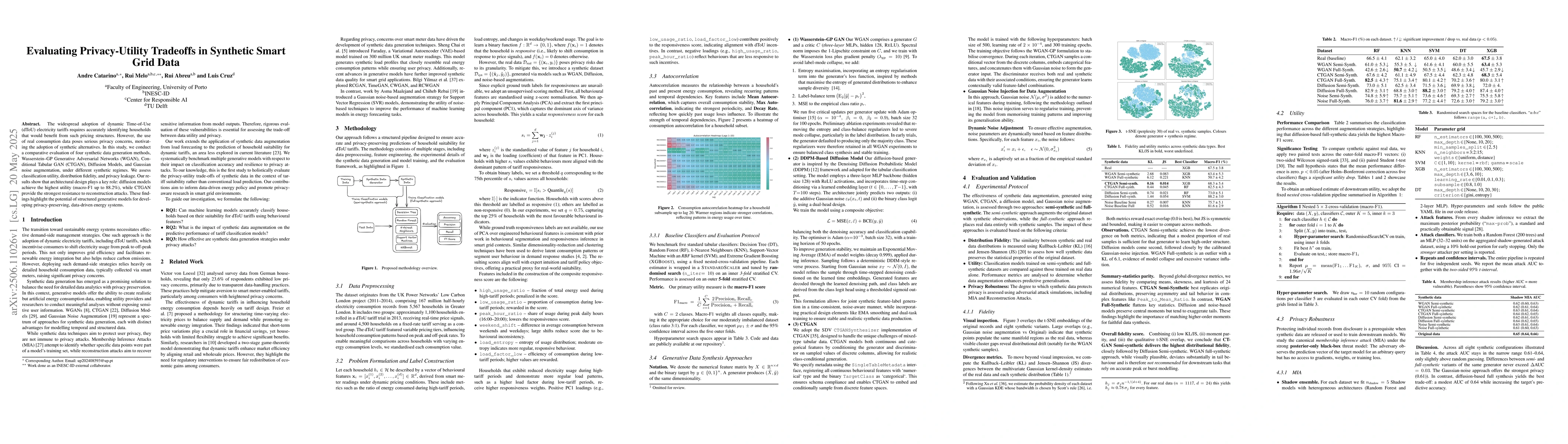 The widespread adoption of dynamic Time-of-Use (dToU) electricity tariffs requires accurately identifying households that would benefit from such pricing structures. However, the use of real consumption data poses serious privacy concerns, motivating the adoption of synthetic alternatives. In this study, we conduct a comparative evaluation of four synthetic data generation methods, Wasserstein-GP Generative Adversarial Networks (WGAN), Conditional Tabular GAN (CTGAN), Diffusion Models, and Gaussian noise augmentation, under different synthetic regimes. We assess classification utility, distribution fidelity, and privacy leakage. Our results show that architectural design plays a key role: diffusion models achieve the highest utility (macro-F1 up to 88.2%), while CTGAN provide the strongest resistance to reconstruction attacks. These findings highlight the potential of structured generative models for developing privacy-preserving, data-driven energy systems.