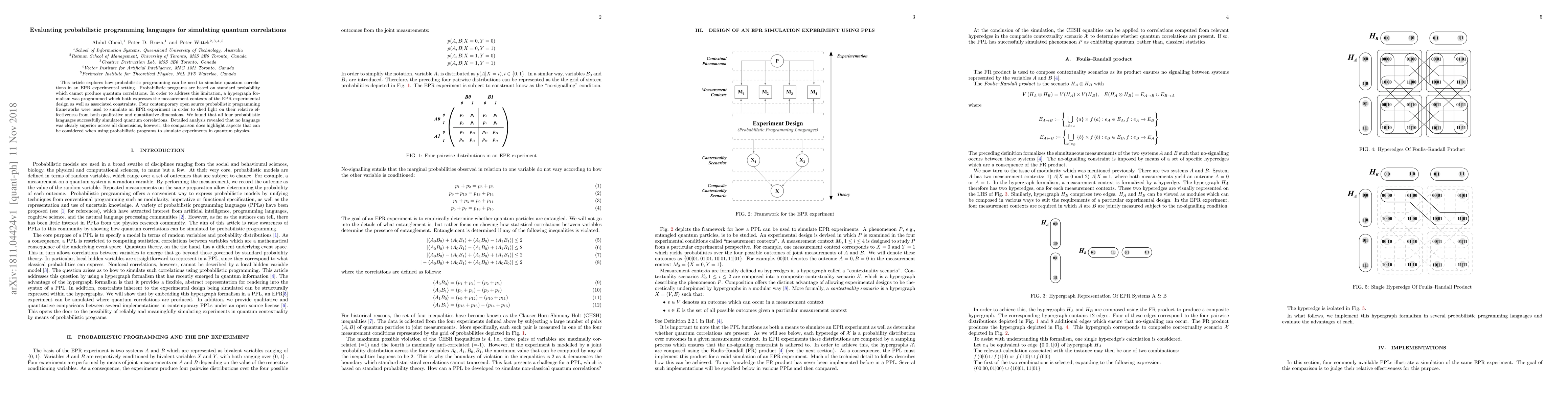This article explores how probabilistic programming can be used to simulate quantum correlations in an EPR experimental setting. Probabilistic programs are based on standard probability which cannot produce quantum correlations. In order to address this limitation, a hypergraph formalism was programmed which both expresses the measurement contexts of the EPR experimental design as well as associated constraints. Four contemporary open source probabilistic programming frameworks were used to simulate an EPR experiment in order to shed light on their relative effectiveness from both qualitative and quantitative dimensions. We found that all four probabilistic languages successfully simulated quantum correlations. Detailed analysis revealed that no language was clearly superior across all dimensions, however, the comparison does highlight aspects that can be considered when using probabilistic programs to simulate experiments in quantum physics.