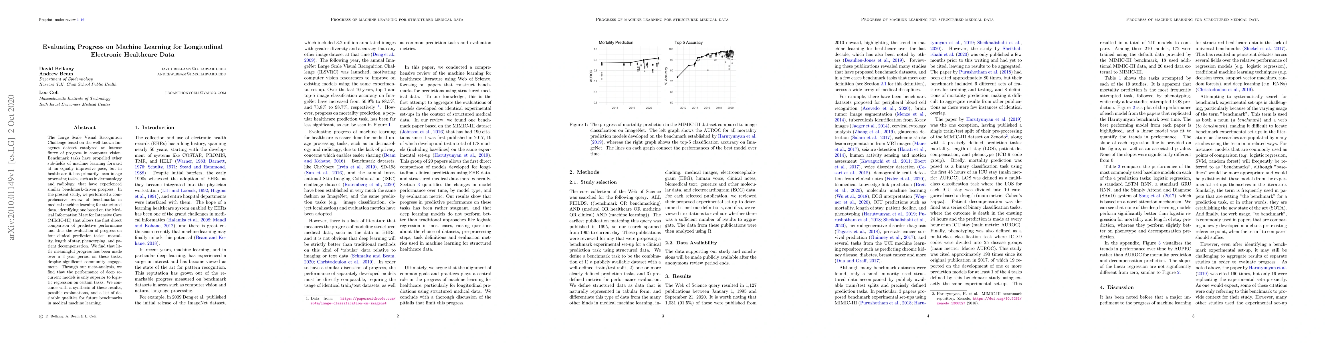 The Large Scale Visual Recognition Challenge based on the well-known Imagenet dataset catalyzed an intense flurry of progress in computer vision. Benchmark tasks have propelled other sub-fields of machine learning forward at an equally impressive pace, but in healthcare it has primarily been image processing tasks, such as in dermatology and radiology, that have experienced similar benchmark-driven progress. In the present study, we performed a comprehensive review of benchmarks in medical machine learning for structured data, identifying one based on the Medical Information Mart for Intensive Care (MIMIC-III) that allows the first direct comparison of predictive performance and thus the evaluation of progress on four clinical prediction tasks: mortality, length of stay, phenotyping, and patient decompensation. We find that little meaningful progress has been made over a 3 year period on these tasks, despite significant community engagement. Through our meta-analysis, we find that the performance of deep recurrent models is only superior to logistic regression on certain tasks. We conclude with a synthesis of these results, possible explanations, and a list of desirable qualities for future benchmarks in medical machine learning.
