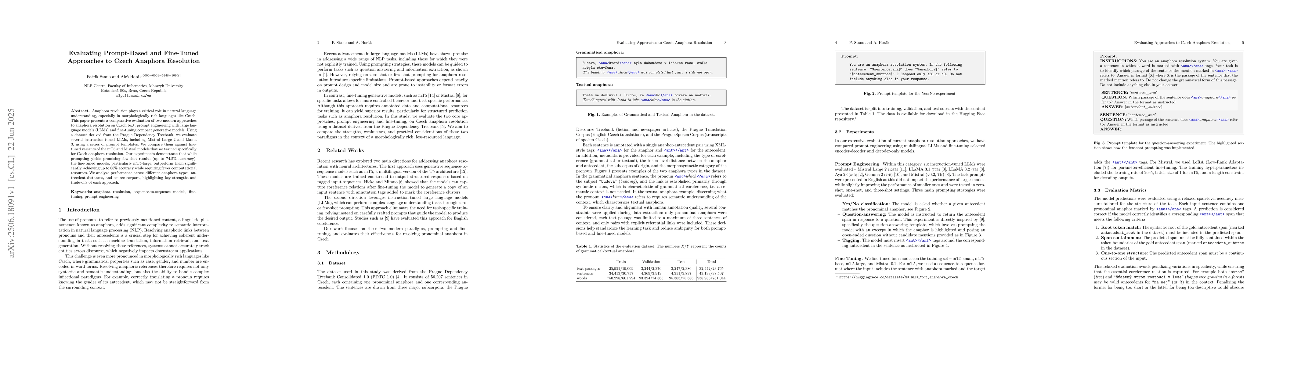 Anaphora resolution plays a critical role in natural language understanding, especially in morphologically rich languages like Czech. This paper presents a comparative evaluation of two modern approaches to anaphora resolution on Czech text: prompt engineering with large language models (LLMs) and fine-tuning compact generative models. Using a dataset derived from the Prague Dependency Treebank, we evaluate several instruction-tuned LLMs, including Mistral Large 2 and Llama 3, using a series of prompt templates. We compare them against fine-tuned variants of the mT5 and Mistral models that we trained specifically for Czech anaphora resolution. Our experiments demonstrate that while prompting yields promising few-shot results (up to 74.5% accuracy), the fine-tuned models, particularly mT5-large, outperform them significantly, achieving up to 88% accuracy while requiring fewer computational resources. We analyze performance across different anaphora types, antecedent distances, and source corpora, highlighting key strengths and trade-offs of each approach.