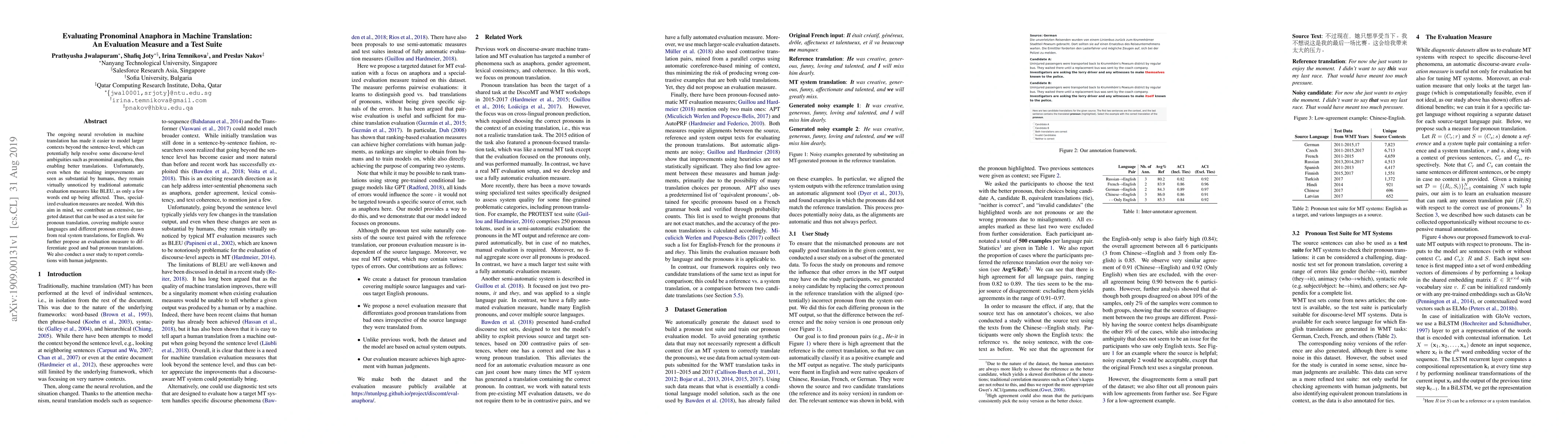 This paper introduces a new dataset and evaluation measure for assessing pronominal anaphora in machine translation, addressing the limitations of traditional metrics like BLEU. It proposes a test suite for pronoun translation and conducts a user study to correlate machine-generated scores with human judgments.