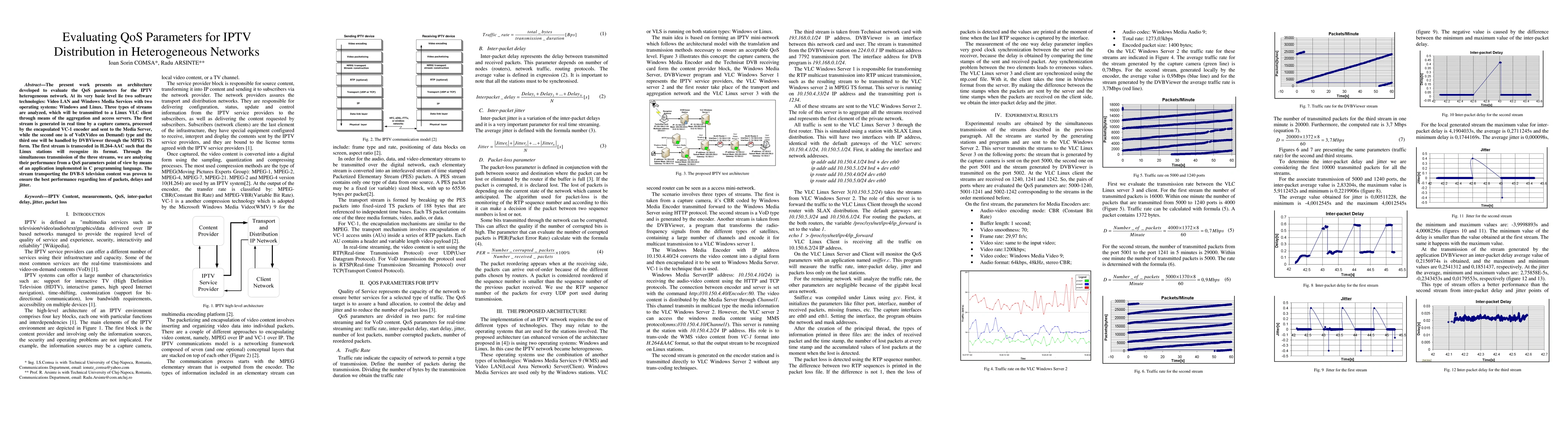 The present work presents an architecture developed to evaluate the QoS parameters for the IPTV heterogeneous network. At its very basic level lie two software technologies: Video LAN and Windows Media Services with two operating systems: Windows and Linux. Three types of streams are analyzed, which will be transmitted to a Linux VLC client through means of the aggregation and access servers. The first stream is generated in real time by a capture camera, processed by the encapsulated VC-1 encoder and sent to the Media Server, while the second one is of VoD(Video on Demand) type and the third one will be handled by DVBViewer through the MPEG TS form. The first stream is transcoded in H.264-AAC such that the Linux stations will recognize its format. Through the simultaneous transmission of the three streams, we are analyzing their performance from a QoS parameters point of view by means of an application implemented in C programming language. The stream transporting the DVB-S television content was proven to ensure the best performance regarding loss of packets, delays and jitter.