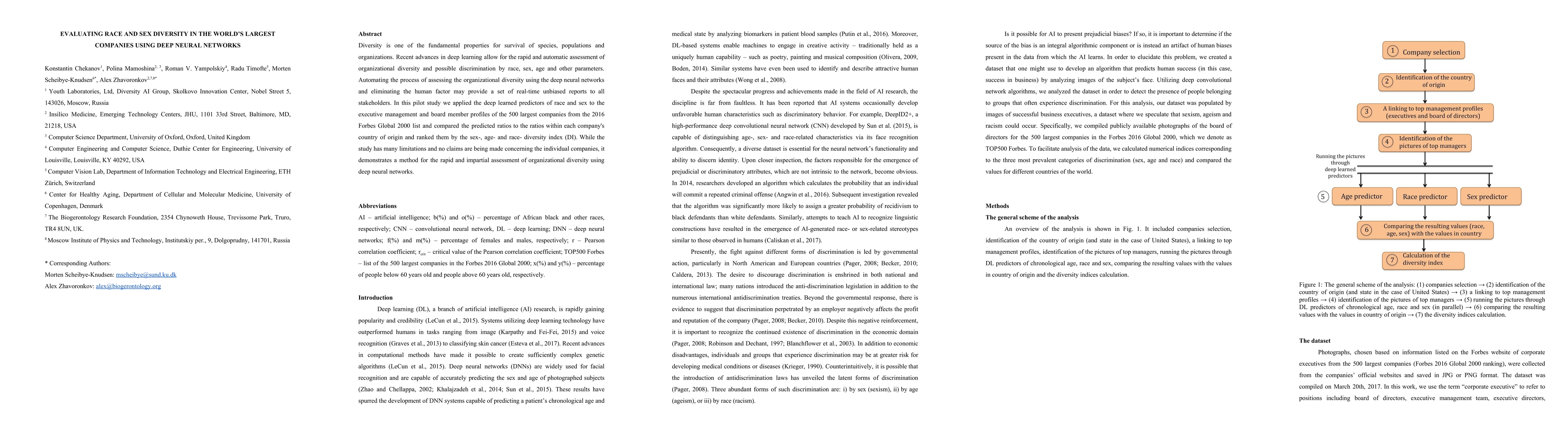 Diversity is one of the fundamental properties for the survival of species, populations, and organizations. Recent advances in deep learning allow for the rapid and automatic assessment of organizational diversity and possible discrimination by race, sex, age and other parameters. Automating the process of assessing the organizational diversity using the deep neural networks and eliminating the human factor may provide a set of real-time unbiased reports to all stakeholders. In this pilot study we applied the deep-learned predictors of race and sex to the executive management and board member profiles of the 500 largest companies from the 2016 Forbes Global 2000 list and compared the predicted ratios to the ratios within each company's country of origin and ranked them by the sex-, age- and race- diversity index (DI). While the study has many limitations and no claims are being made concerning the individual companies, it demonstrates a method for the rapid and impartial assessment of organizational diversity using deep neural networks.