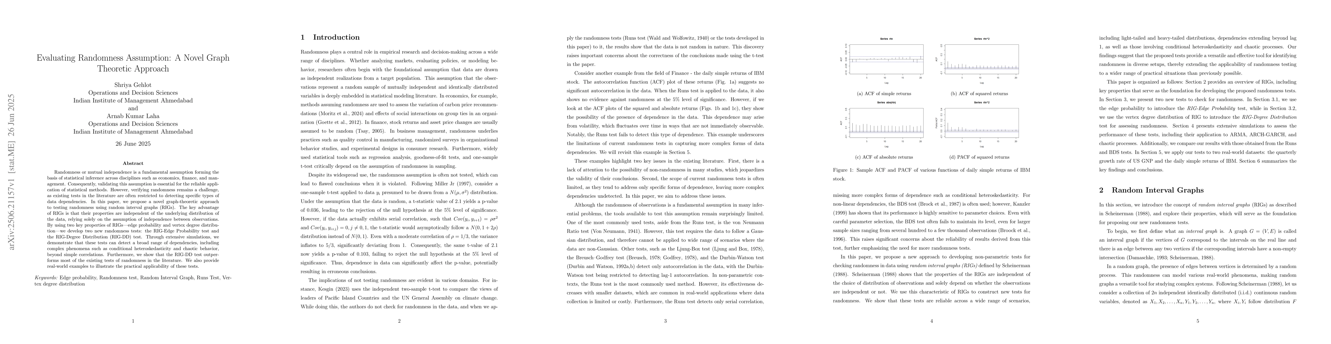 Randomness or mutual independence is a fundamental assumption forming the basis of statistical inference across disciplines such as economics, finance, and management. Consequently, validating this assumption is essential for the reliable application of statistical methods. However, verifying randomness remains a challenge, as existing tests in the literature are often restricted to detecting specific types of data dependencies. In this paper, we propose a novel graph-theoretic approach to testing randomness using random interval graphs (RIGs). The key advantage of RIGs is that their properties are independent of the underlying distribution of the data, relying solely on the assumption of independence between observations. By using two key properties of RIGs-edge probability and vertex degree distribution-we develop two new randomness tests: the RIG-Edge Probability test and the RIG-Degree Distribution (RIG-DD) test. Through extensive simulations, we demonstrate that these tests can detect a broad range of dependencies, including complex phenomena such as conditional heteroskedasticity and chaotic behavior, beyond simple correlations. Furthermore, we show that the RIG-DD test outperforms most of the existing tests of randomness in the literature. We also provide real-world examples to illustrate the practical applicability of these tests.