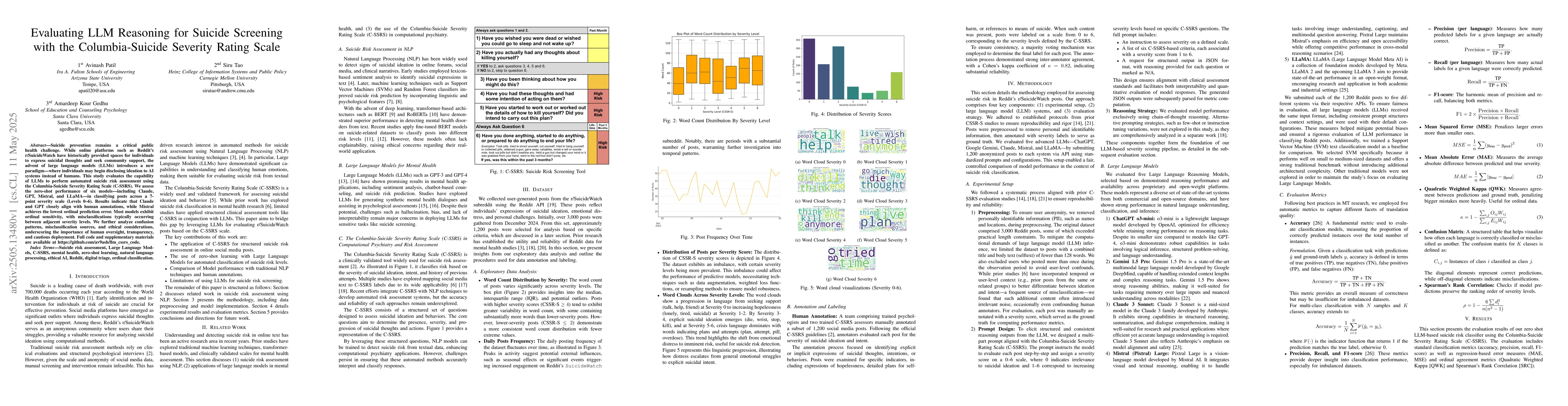 The study evaluates the zero-shot performance of six LLMs (Claude, GPT, Mistral, and LLaMA) in classifying posts from Reddit's r/SuicideWatch into a 7-point severity scale using the C-SSRS.