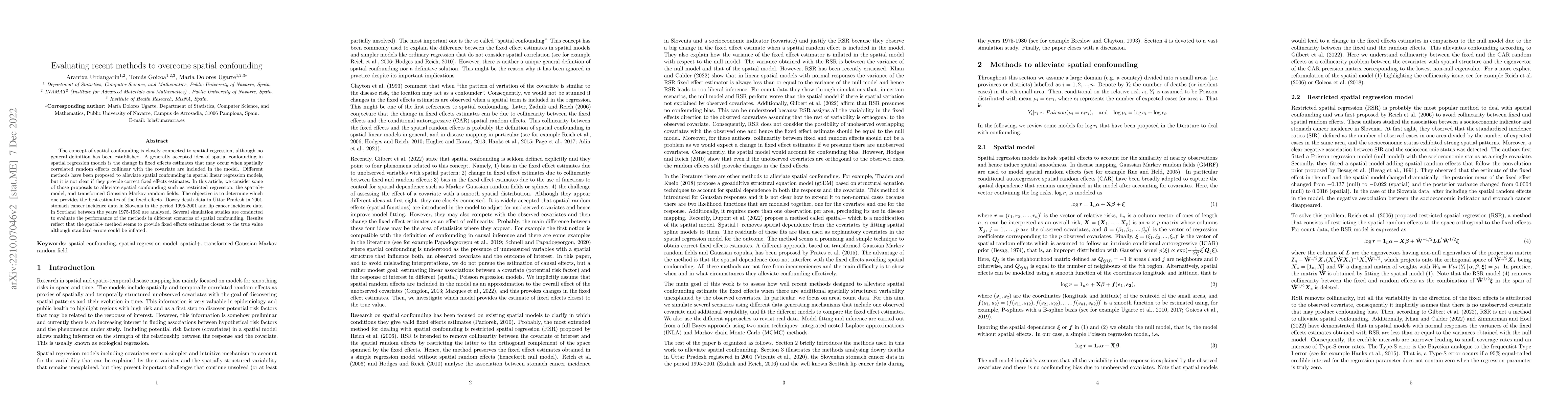 The concept of spatial confounding is closely connected to spatial regression, although no general definition has been established. A generally accepted idea of spatial confounding in spatial regression models is the change in fixed effects estimates that may occur when spatially correlated random effects collinear with the covariate are included in the model. Different methods have been proposed to alleviate spatial confounding in spatial linear regression models, but it is not clear if they provide correct fixed effects estimates. In this article, we consider some of those proposals to alleviate spatial confounding such as restricted regression, the spatial+ model, and transformed Gaussian Markov random fields. The objective is to determine which one provides the best estimates of the fixed effects. Dowry death data in Uttar Pradesh in 2001, stomach cancer incidence data in Slovenia in the period 1995-2001 and lip cancer incidence data in Scotland between the years 1975-1980 are analyzed. Several simulation studies are conducted to evaluate the performance of the methods in different scenarios of spatial confounding. Results reflect that the spatial+ method seems to provide fixed effects estimates closest to the true value.