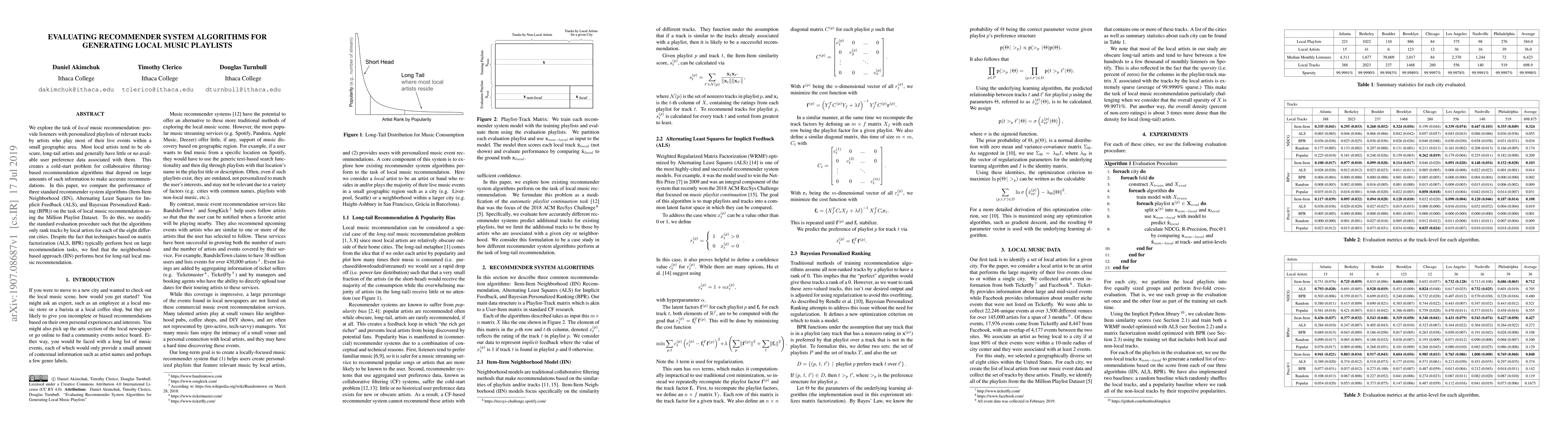 This paper evaluates three recommender system algorithms for generating local music playlists, focusing on obscure artists with little preference data. The study finds that the neighborhood-based Item-Item Neighborhood approach outperforms matrix factorization techniques like ALS and BPR for local music recommendations.
