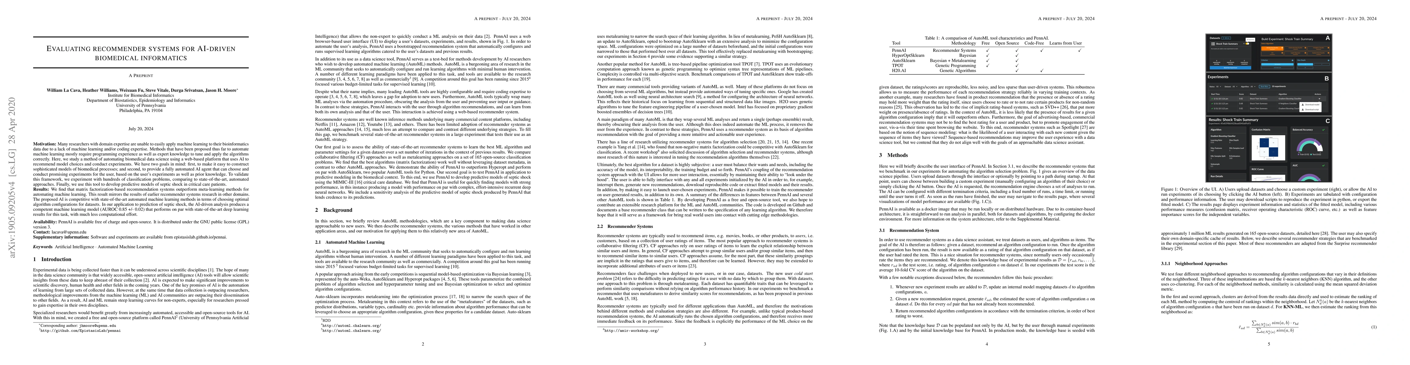 Motivation: Many researchers with domain expertise are unable to easily apply machine learning to their bioinformatics data due to a lack of machine learning and/or coding expertise. Methods that have been proposed thus far to automate machine learning mostly require programming experience as well as expert knowledge to tune and apply the algorithms correctly. Here, we study a method of automating biomedical data science using a web-based platform that uses AI to recommend model choices and conduct experiments. We have two goals in mind: first, to make it easy to construct sophisticated models of biomedical processes; and second, to provide a fully automated AI agent that can choose and conduct promising experiments for the user, based on the user's experiments as well as prior knowledge. To validate this framework, we experiment with hundreds of classification problems, comparing to state-of-the-art, automated approaches. Finally, we use this tool to develop predictive models of septic shock in critical care patients. Results: We find that matrix factorization-based recommendation systems outperform meta-learning methods for automating machine learning. This result mirrors the results of earlier recommender systems research in other domains. The proposed AI is competitive with state-of-the-art automated machine learning methods in terms of choosing optimal algorithm configurations for datasets. In our application to prediction of septic shock, the AI-driven analysis produces a competent machine learning model (AUROC 0.85 +/- 0.02) that performs on par with state-of-the-art deep learning results for this task, with much less computational effort.