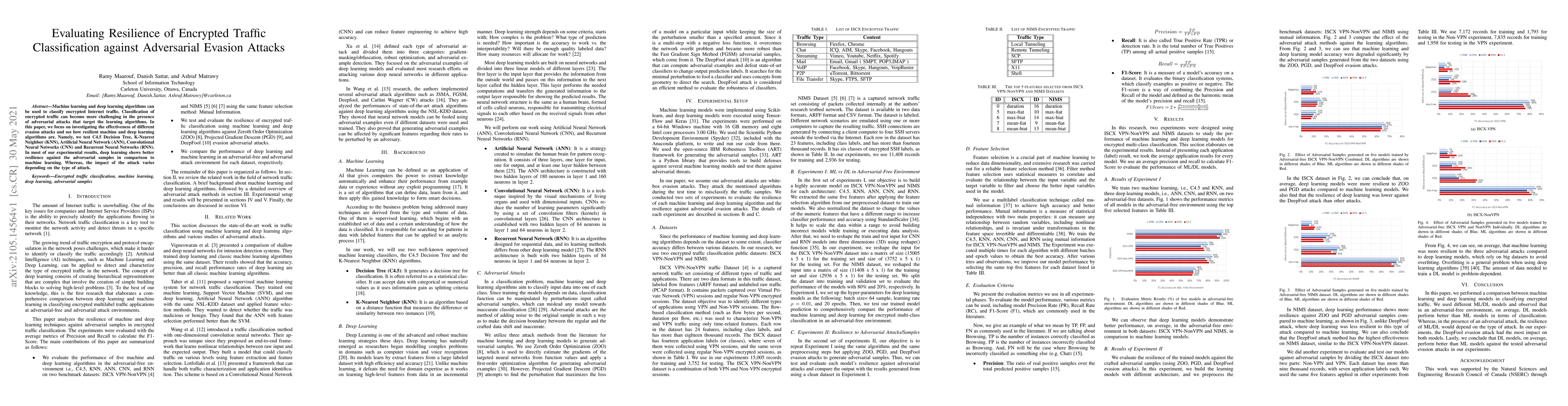 This paper investigates the resilience of machine and deep learning algorithms like C4.5, KNN, ANN, CNN, and RNN against adversarial evasion attacks targeting encrypted traffic classification. Deep learning algorithms generally demonstrate higher resilience compared to machine learning, though the effectiveness varies with the type of attack used.
