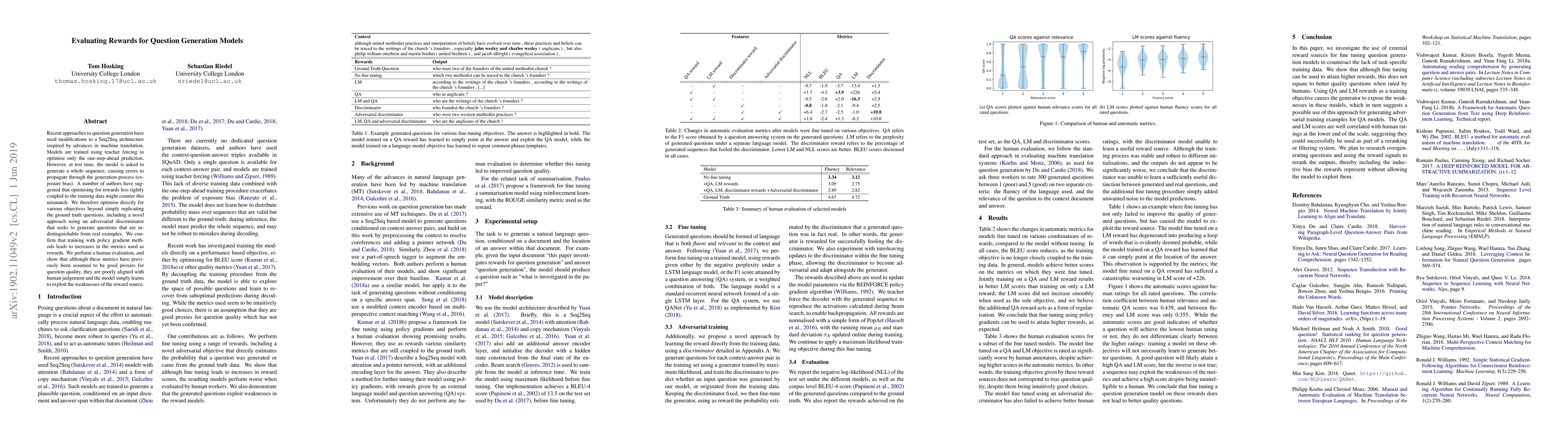 Researchers improved question generation models by using a novel approach to decouple training from ground truth, leading to increased metrics but poor alignment with human judgement. They found that traditional quality metrics can be exploited by the model.