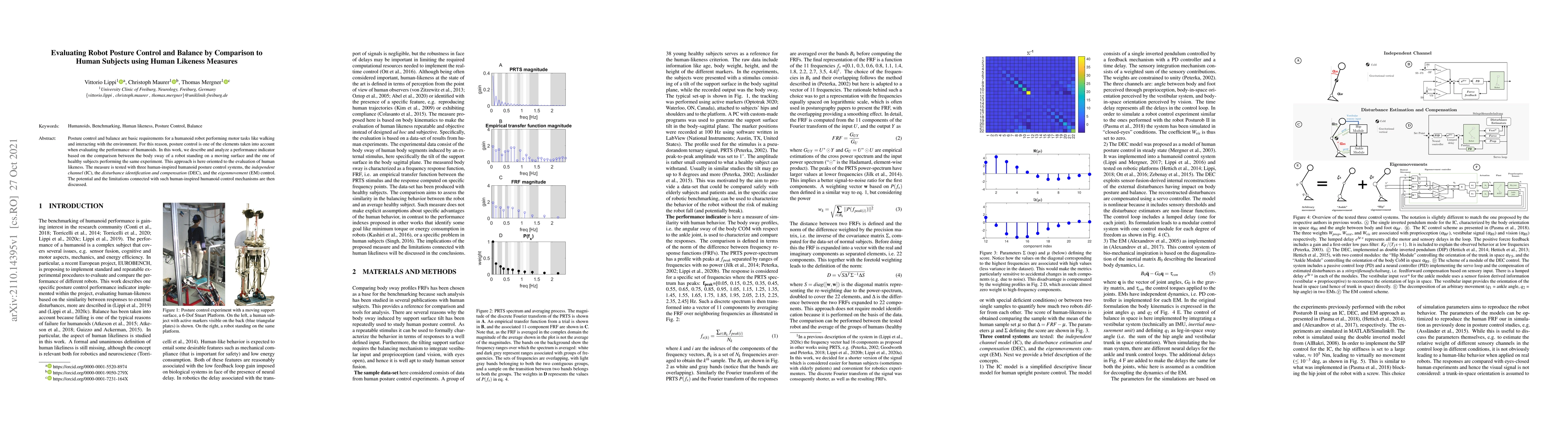 This research evaluates the posture control and balance of humanoid robots by comparing their body sway on a moving surface to that of healthy human subjects. It assesses three human-inspired control mechanisms: independent channel, disturbance identification and compensation, and eigenmovement, discussing their effectiveness and limitations in mimicking human balance.