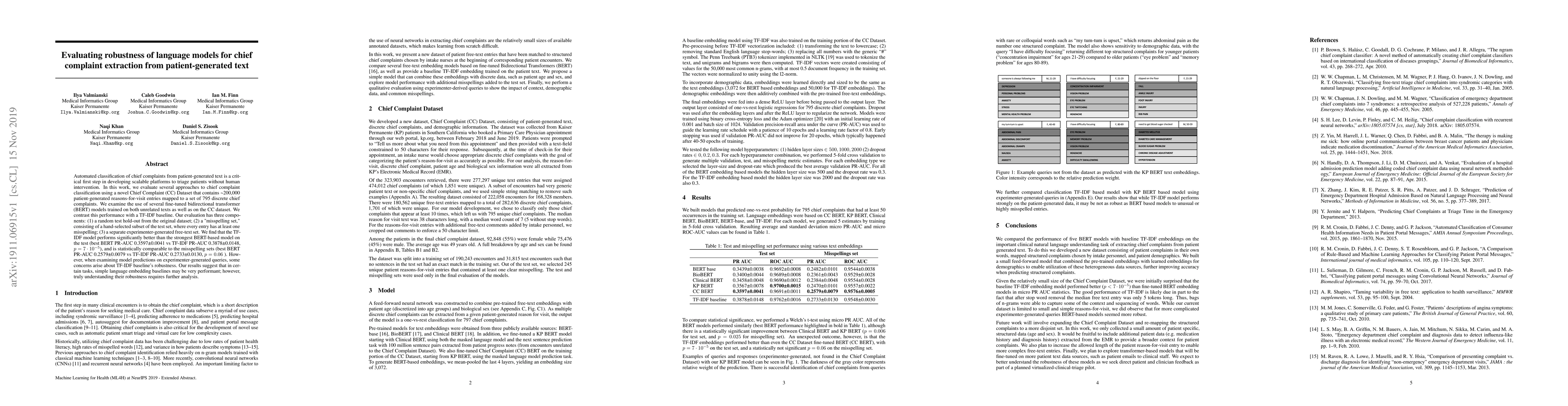 Automated classification of chief complaints from patient-generated text is a critical first step in developing scalable platforms to triage patients without human intervention. In this work, we evaluate several approaches to chief complaint classification using a novel Chief Complaint (CC) Dataset that contains ~200,000 patient-generated reasons-for-visit entries mapped to a set of 795 discrete chief complaints. We examine the use of several fine-tuned bidirectional transformer (BERT) models trained on both unrelated texts as well as on the CC dataset. We contrast this performance with a TF-IDF baseline. Our evaluation has three components: (1) a random test hold-out from the original dataset; (2) a "misspelling set," consisting of a hand-selected subset of the test set, where every entry has at least one misspelling; (3) a separate experimenter-generated free-text set. We find that the TF-IDF model performs significantly better than the strongest BERT-based model on the test (best BERT PR-AUC $0.3597 \pm 0.0041$ vs TF-IDF PR-AUC $0.3878 \pm 0.0148$, $p=7\cdot 10^{-5}$), and is statistically comparable to the misspelling sets (best BERT PR-AUC $0.2579 \pm 0.0079$ vs TF-IDF PR-AUC $0.2733 \pm 0.0130$, $p=0.06$). However, when examining model predictions on experimenter-generated queries, some concerns arise about TF-IDF baseline's robustness. Our results suggest that in certain tasks, simple language embedding baselines may be very performant; however, truly understanding their robustness requires further analysis.
