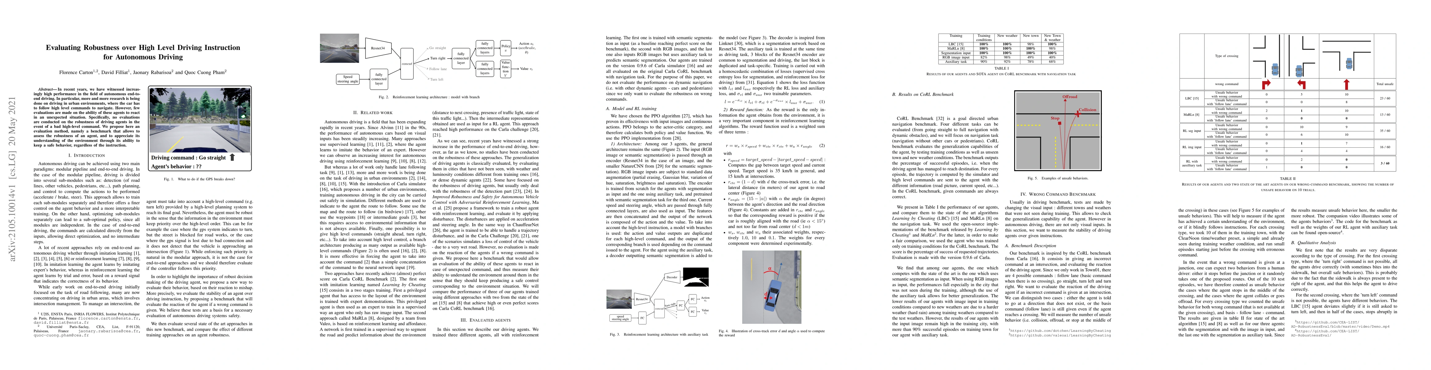 In recent years, we have witnessed increasingly high performance in the field of autonomous end-to-end driving. In particular, more and more research is being done on driving in urban environments, where the car has to follow high level commands to navigate. However, few evaluations are made on the ability of these agents to react in an unexpected situation. Specifically, no evaluations are conducted on the robustness of driving agents in the event of a bad high-level command. We propose here an evaluation method, namely a benchmark that allows to assess the robustness of an agent, and to appreciate its understanding of the environment through its ability to keep a safe behavior, regardless of the instruction.