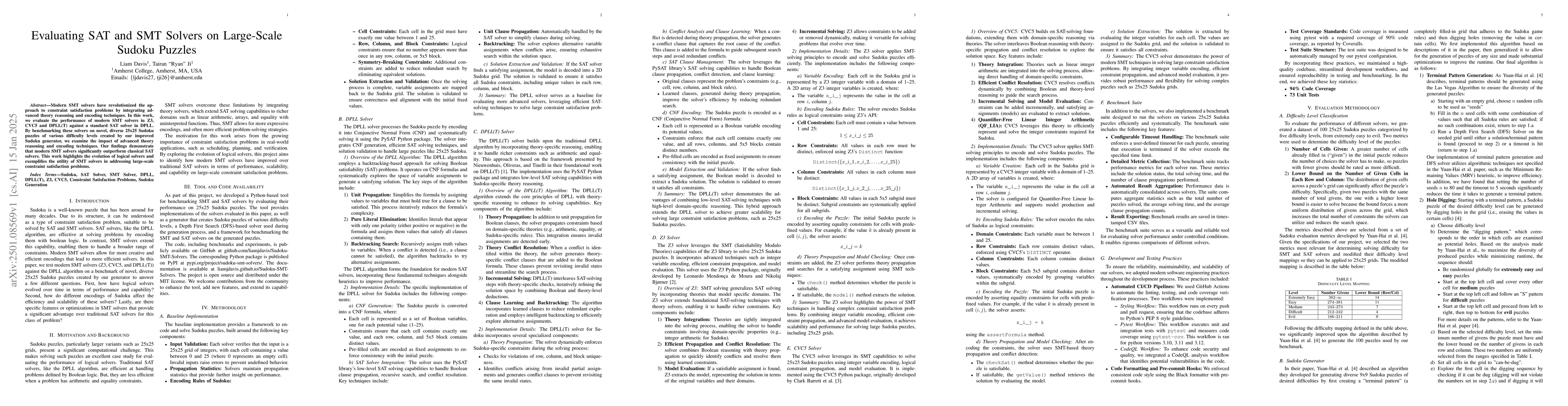 This research evaluates the performance of modern SMT solvers (Z3, CVC5, DPLL(T)) against a standard SAT solver (DPLL) on large-scale 25x25 Sudoku puzzles. Results show that SMT solvers significantly outperform SAT solvers, highlighting the advantages of advanced theory reasoning and encoding techniques in constraint satisfaction problems.
