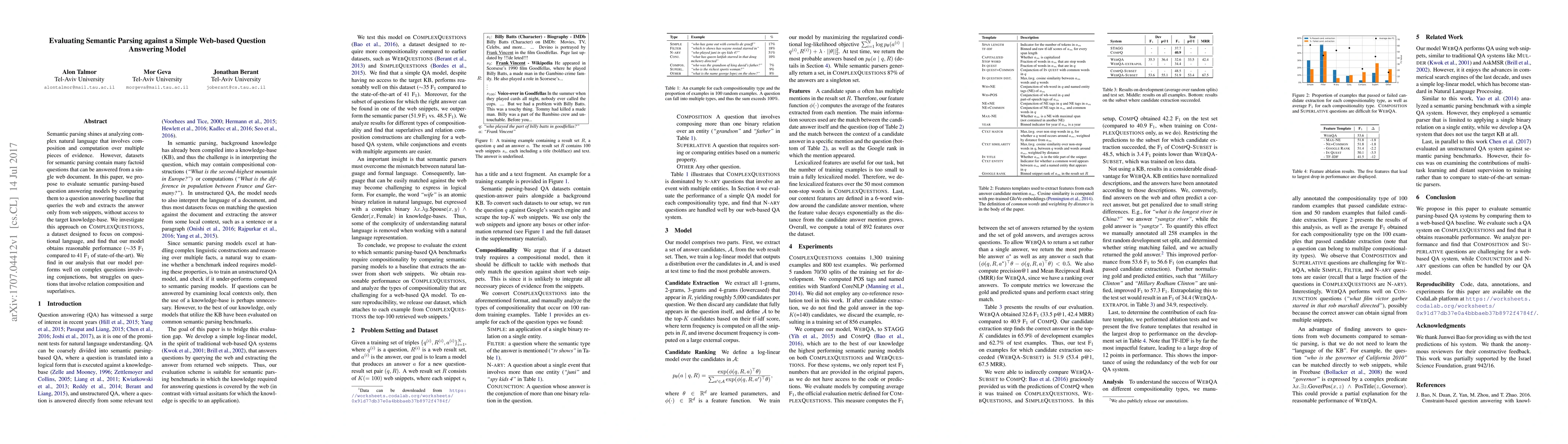 This research evaluates semantic parsing models for question answering by comparing them against a web-based baseline that extracts answers directly from web snippets. On the COMPLEXQUESTIONS dataset, the semantic parsing model achieves a 35 F1 score, compared to 41 for the state-of-the-art, showing strength in handling complex, conjunction-based questions but difficulty with relation composition and superlatives.