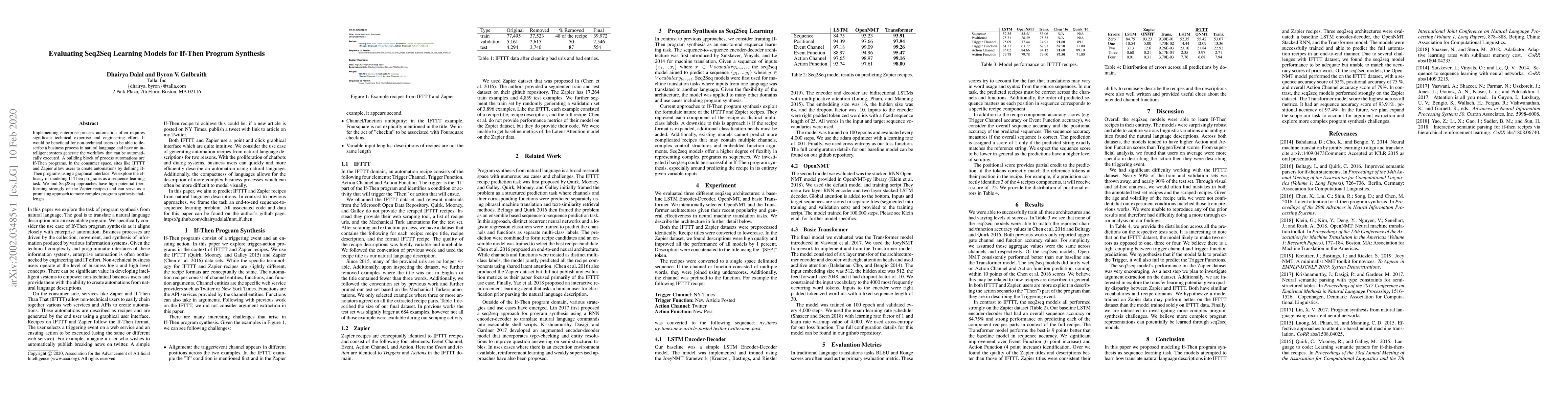 Implementing enterprise process automation often requires significant technical expertise and engineering effort. It would be beneficial for non-technical users to be able to describe a business process in natural language and have an intelligent system generate the workflow that can be automatically executed. A building block of process automations are If-Then programs. In the consumer space, sites like IFTTT and Zapier allow users to create automations by defining If-Then programs using a graphical interface. We explore the efficacy of modeling If-Then programs as a sequence learning task. We find Seq2Seq approaches have high potential (performing strongly on the Zapier recipes) and can serve as a promising approach to more complex program synthesis challenges.