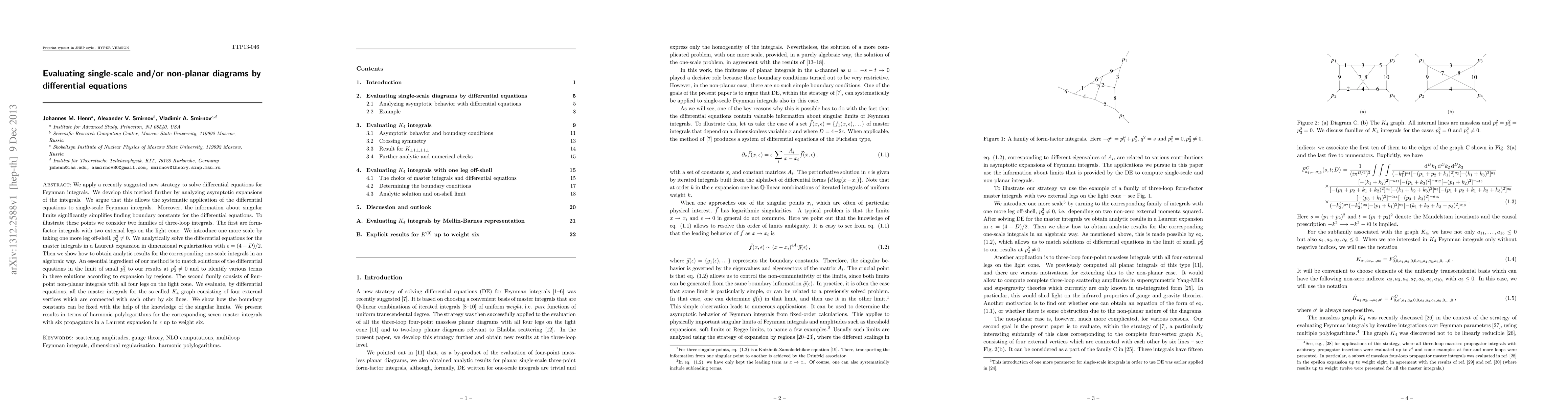We apply a recently suggested new strategy to solve differential equations for Feynman integrals. We develop this method further by analyzing asymptotic expansions of the integrals. We argue that this allows the systematic application of the differential equations to single-scale Feynman integrals. Moreover, the information about singular limits significantly simplifies finding boundary constants for the differential equations. To illustrate these points we consider two families of three-loop integrals. The first are form-factor integrals with two external legs on the light cone. We introduce one more scale by taking one more leg off-shell, $p_2^2\neq 0$. We analytically solve the differential equations for the master integrals in a Laurent expansion in dimensional regularization with $\epsilon=(4-D)/2$. Then we show how to obtain analytic results for the corresponding one-scale integrals in an algebraic way. An essential ingredient of our method is to match solutions of the differential equations in the limit of small $p_2^2$ to our results at $p_2^2\neq 0$ and to identify various terms in these solutions according to expansion by regions. The second family consists of four-point non-planar integrals with all four legs on the light cone. We evaluate, by differential equations, all the master integrals for the so-called $K_4$ graph consisting of four external vertices which are connected with each other by six lines. We show how the boundary constants can be fixed with the help of the knowledge of the singular limits. We present results in terms of harmonic polylogarithms for the corresponding seven master integrals with six propagators in a Laurent expansion in $\epsilon$ up to weight six.
