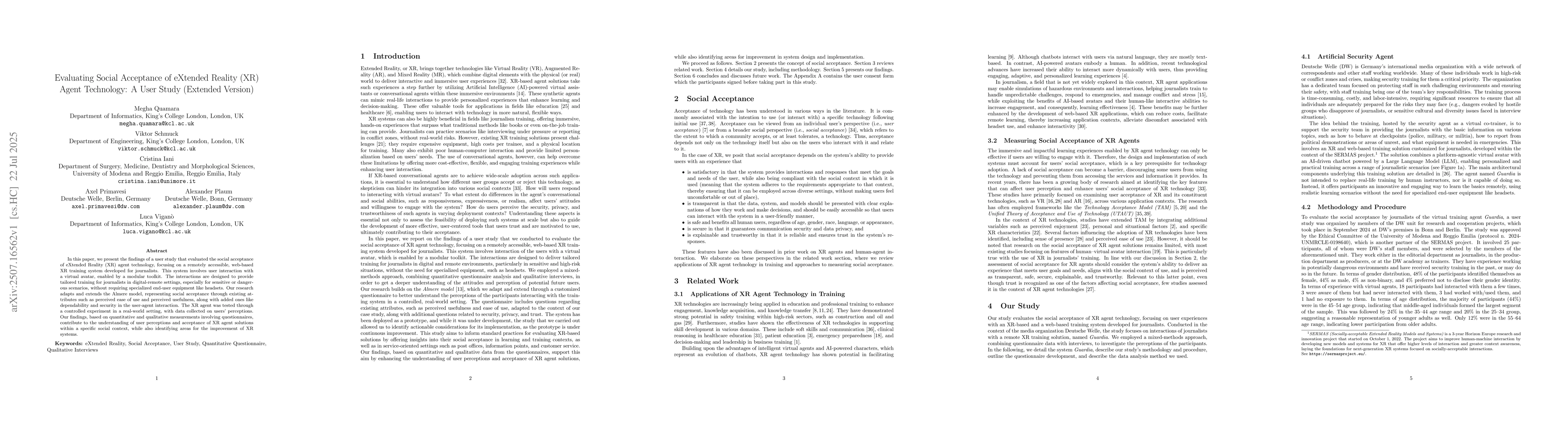 In this paper, we present the findings of a user study that evaluated the social acceptance of eXtended Reality (XR) agent technology, focusing on a remotely accessible, web-based XR training system developed for journalists. This system involves user interaction with a virtual avatar, enabled by a modular toolkit. The interactions are designed to provide tailored training for journalists in digital-remote settings, especially for sensitive or dangerous scenarios, without requiring specialized end-user equipment like headsets. Our research adapts and extends the Almere model, representing social acceptance through existing attributes such as perceived ease of use and perceived usefulness, along with added ones like dependability and security in the user-agent interaction. The XR agent was tested through a controlled experiment in a real-world setting, with data collected on users' perceptions. Our findings, based on quantitative and qualitative measurements involving questionnaires, contribute to the understanding of user perceptions and acceptance of XR agent solutions within a specific social context, while also identifying areas for the improvement of XR systems.
