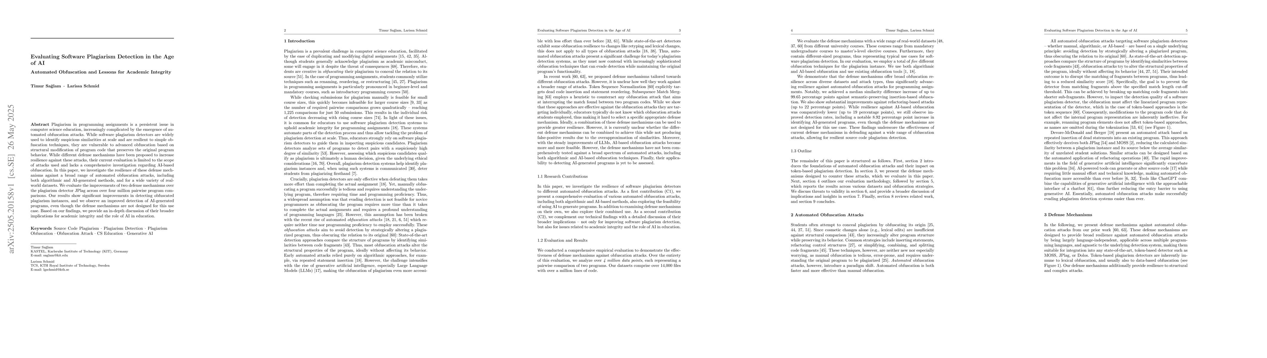 Researchers evaluated software plagiarism detection in the age of AI, finding significant improvements in detecting obfuscated plagiarisms using defense mechanisms against automated obfuscation attacks, including AI-generated methods.