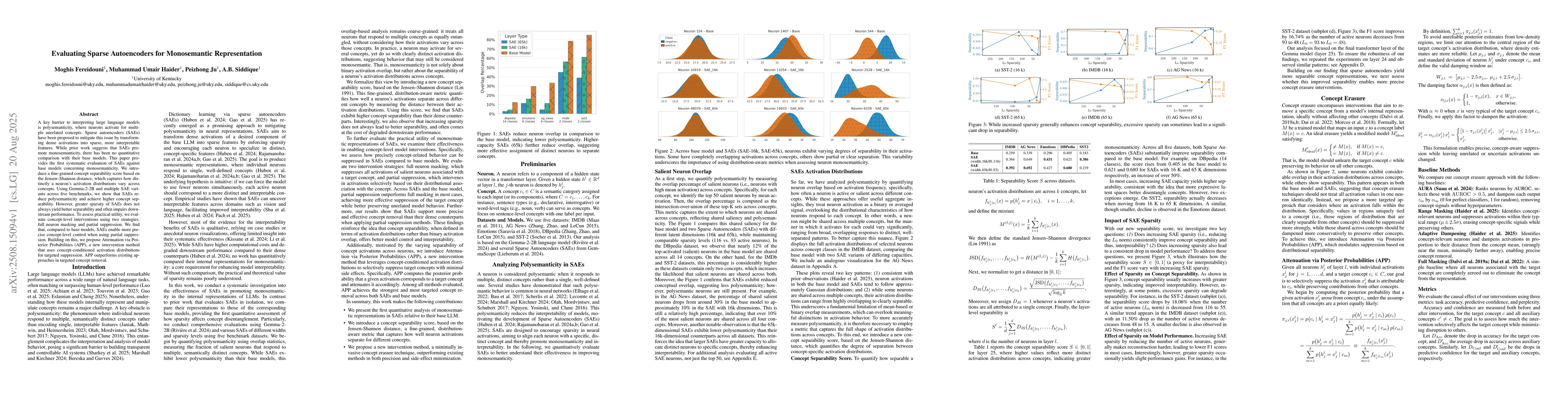 A key barrier to interpreting large language models is polysemanticity, where neurons activate for multiple unrelated concepts. Sparse autoencoders (SAEs) have been proposed to mitigate this issue by transforming dense activations into sparse, more interpretable features. While prior work suggests that SAEs promote monosemanticity, there has been no quantitative comparison with their base models. This paper provides the first systematic evaluation of SAEs against base models concerning monosemanticity. We introduce a fine-grained concept separability score based on the Jensen-Shannon distance, which captures how distinctly a neuron's activation distributions vary across concepts. Using Gemma-2-2B and multiple SAE variants across five benchmarks, we show that SAEs reduce polysemanticity and achieve higher concept separability. However, greater sparsity of SAEs does not always yield better separability and often impairs downstream performance. To assess practical utility, we evaluate concept-level interventions using two strategies: full neuron masking and partial suppression. We find that, compared to base models, SAEs enable more precise concept-level control when using partial suppression. Building on this, we propose Attenuation via Posterior Probabilities (APP), a new intervention method that uses concept-conditioned activation distributions for targeted suppression. APP outperforms existing approaches in targeted concept removal.