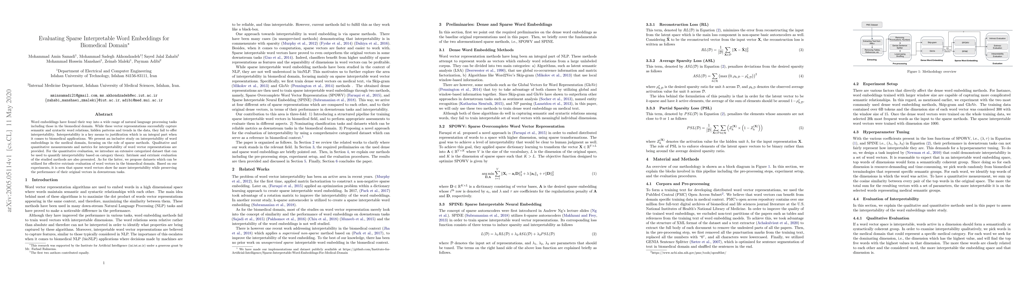 This paper evaluates sparse interpretable word embeddings for biomedical applications, highlighting their improved interpretability compared to dense embeddings while maintaining performance. It introduces new datasets and metrics for both intrinsic and extrinsic evaluation of word vector interpretability in the medical domain.