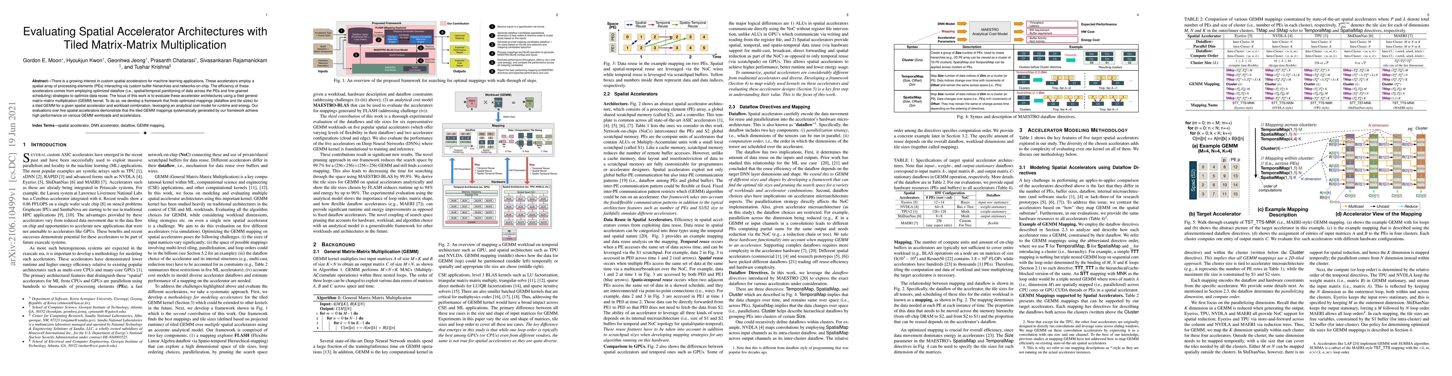 This paper evaluates custom spatial accelerator architectures for machine learning by optimizing tiled matrix-matrix multiplication (GEMM) kernels. The developed framework finds optimized dataflow and tile sizes, achieving high performance across various accelerators and workloads.