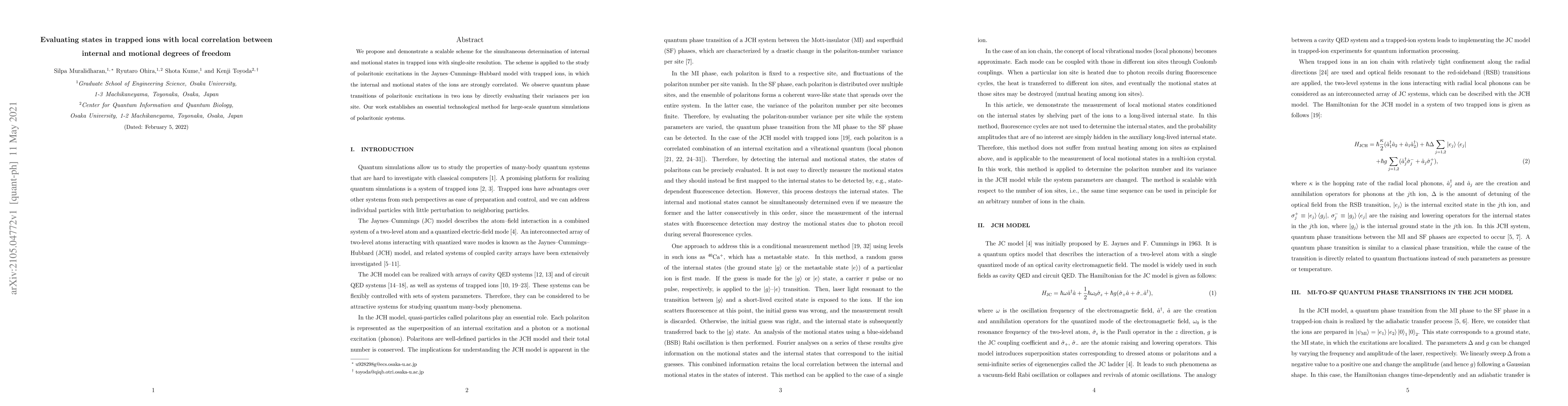 We propose and demonstrate a scalable scheme for the simultaneous determination of internal and motional states in trapped ions with single-site resolution. The scheme is applied to the study of polaritonic excitations in the Jaynes- Cummings Hubbard model with trapped ions, in which the internal and motional states of the ions are strongly correlated. We observe quantum phase transitions of polaritonic excitations in two ions by directly evaluating their variances per ion site. Our work establishes an essential technological method for large-scale quantum simulations of polaritonic systems.