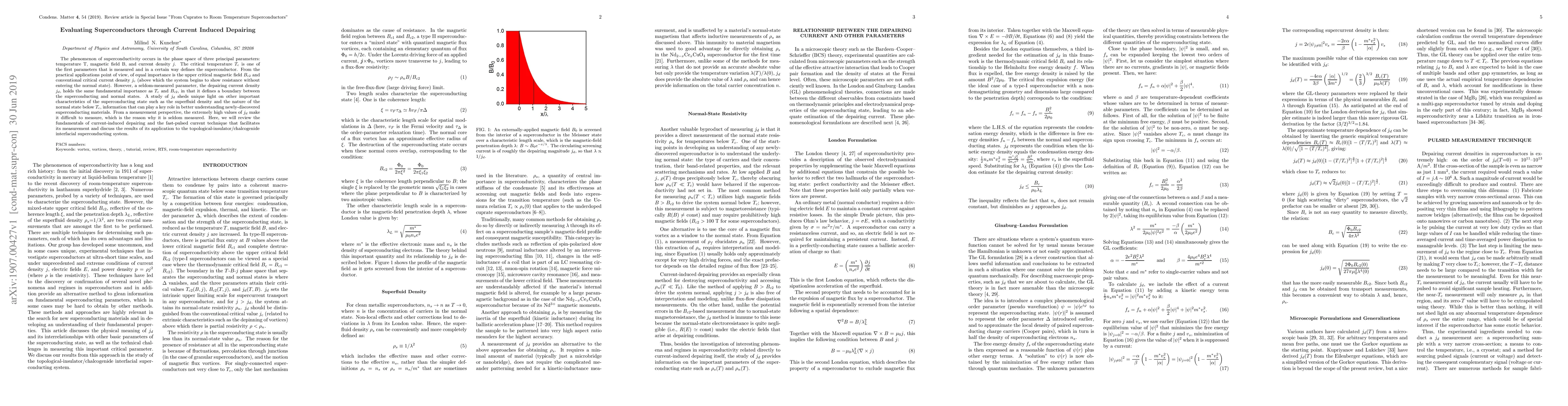 The phenomenon of superconductivity occurs in the phase space of three principal parameters: temperature T, magnetic field B, and current density Jd . The critical temperature Tc is one of the first parameters that is measured and in a certain way defines the superconductor. From the practical applications point of view, of equal importance is the upper critical magnetic field Bc2 and conventional critical current density Jc (above which the system begins to show resistance without entering the normal state). However, a seldom-measured parameter, the depairing current density Jd , holds the same fundamental importance as Tc and Bc2, in that it defines a boundary between the superconducting and normal states. A study of Jd sheds unique light on other important characteristics of the superconducting state such as the superfluid density and the nature of the normal state below Tc, information that can play a key role in better understanding newly-discovered superconducting materials. From a measurement perspective, the extremely high values of Jd make it difficult to measure, which is the reason why it is seldom measured. Here, we will review the fundamentals of current-induced depairing and the fast-pulsed current technique that facilitates its measurement and discuss the results of its application to the topological-insulator/chalcogenide interfacial superconducting system. Keywords: pairbreaking, pair-breaking, vortex, vortices, theory, tutorial, RTS, room-temperature supeconductivity
