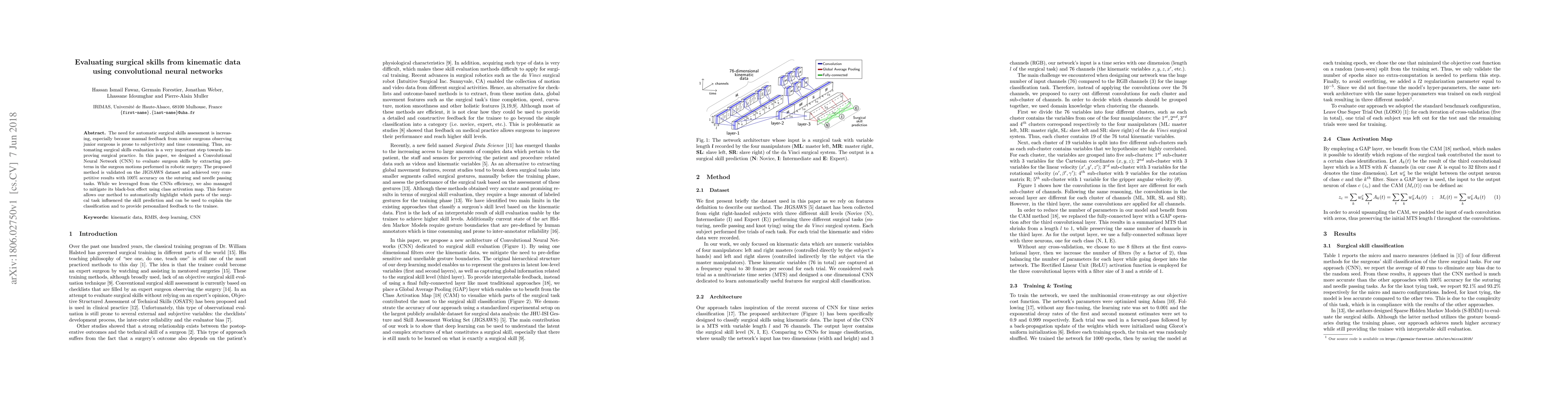 This paper proposes a Convolutional Neural Network (CNN) to automatically assess surgical skills by analyzing kinematic data from robotic surgery, achieving 100% accuracy on suturing and needle passing tasks. The method also uses class activation maps to explain the model's predictions and provide personalized feedback to trainees.
