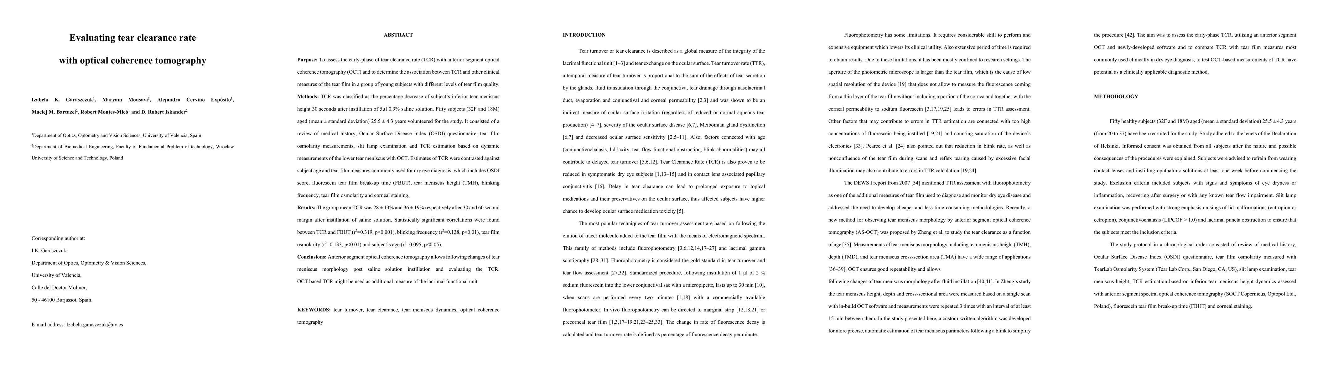 This study uses optical coherence tomography (OCT) to evaluate tear clearance rate (TCR) in young subjects, finding significant correlations between TCR and factors like tear film break-up time, blinking frequency, and tear osmolarity, suggesting OCT-based TCR as a potential additional diagnostic tool for dry eye conditions.