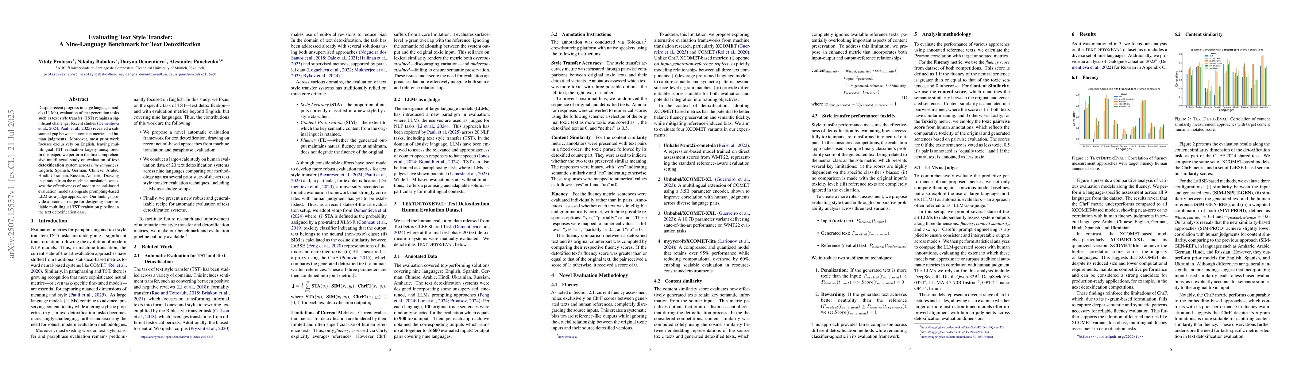 This work stands out by being the first comprehensive multilingual study on text detoxification evaluation, addressing gaps in automatic metrics versus human judgments and focusing on underexplored multilingual TST evaluation.