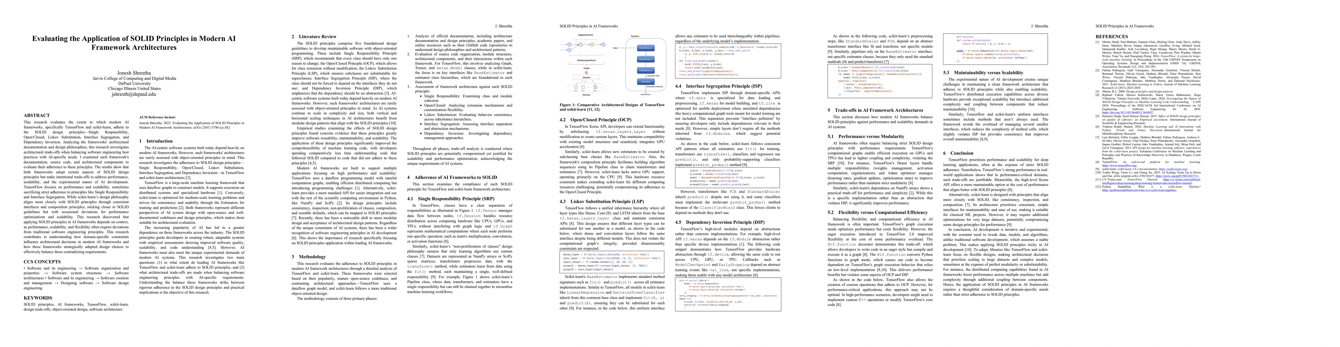Detailed examination of TensorFlow and scikit-learn architectures against SOLID principles, revealing trade-offs and context-dependent application of these principles in AI frameworks.