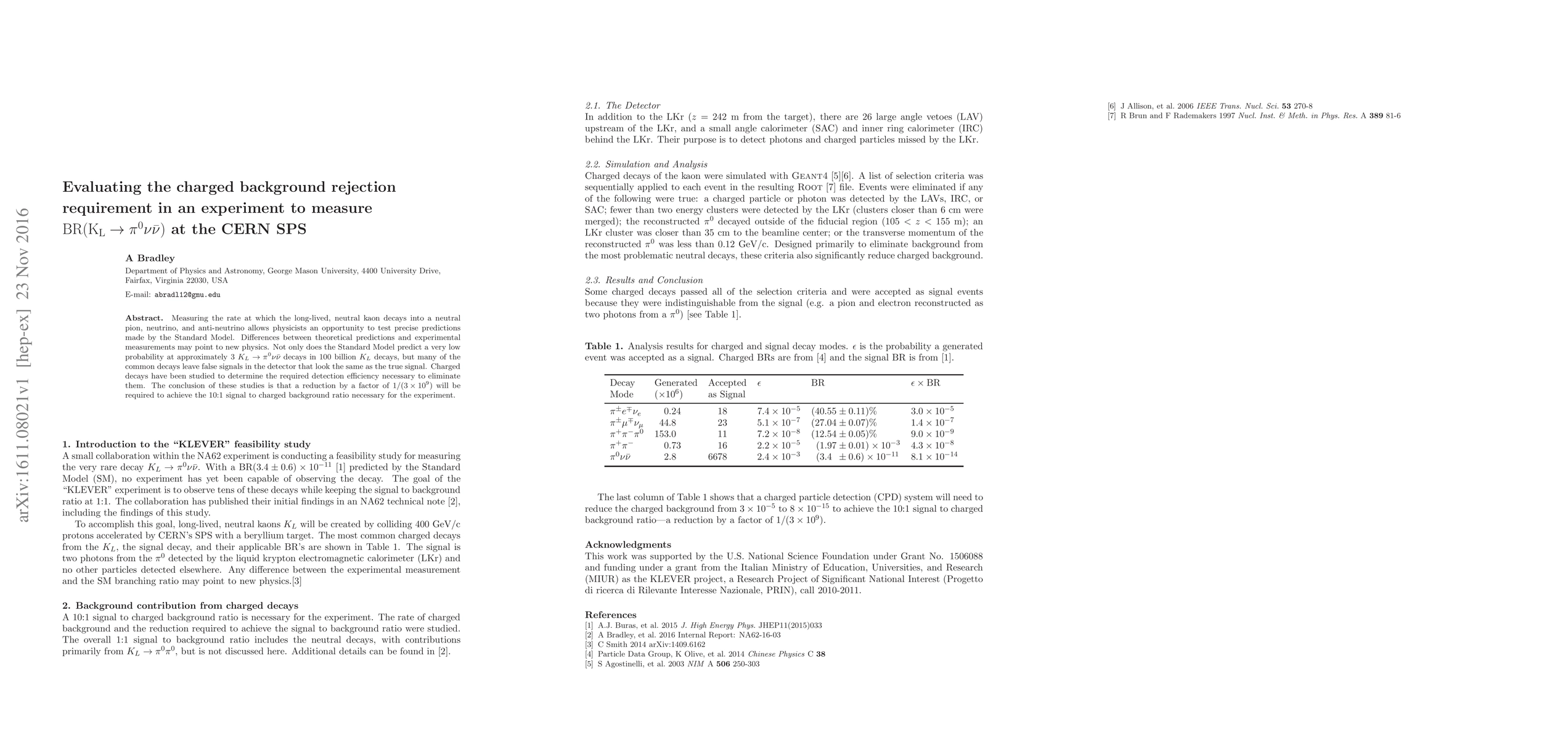Measuring the rate at which the long-lived, neutral kaon decays into a neutral pion, neutrino, and anti-neutrino allows physicists an opportunity to test precise predictions made by the Standard Model. Differences between theoretical predictions and experimental measurements may point to new physics. Not only does the Standard Model predict a very low probability at approximately 3 $K_L \to \pi^0 \nu \bar{\nu}$ decays in 100 billion $K_L$ decays, but many of the common decays leave false signals in the detector that look the same as the true signal. Charged decays have been studied to determine the required detection efficiency necessary to eliminate them. The conclusion of these studies is that a reduction by a factor of $1/(3\times10^9)$ will be required to achieve the 10:1 signal to charged background ratio necessary for the experiment.