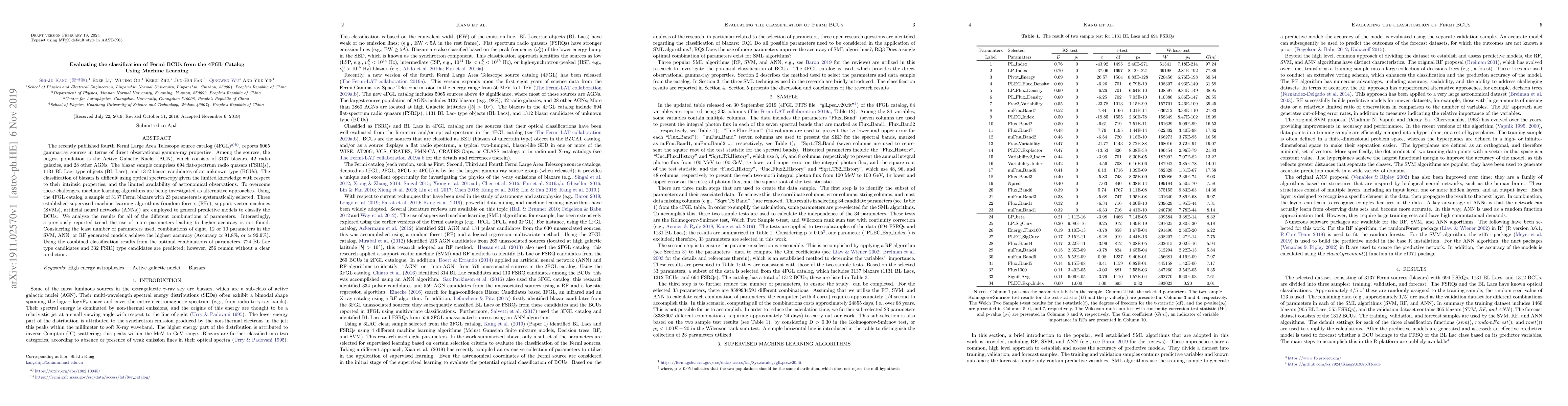 This paper evaluates the classification of Fermi blazar candidates (BCUs) from the 4FGL catalog using supervised machine learning algorithms. Despite employing three algorithms (RFs, SVMs, ANNs) with various parameter combinations, the highest accuracy (around 92%) is achieved using the least number of parameters (8-12), contrary to the expectation that more parameters would lead to better results.