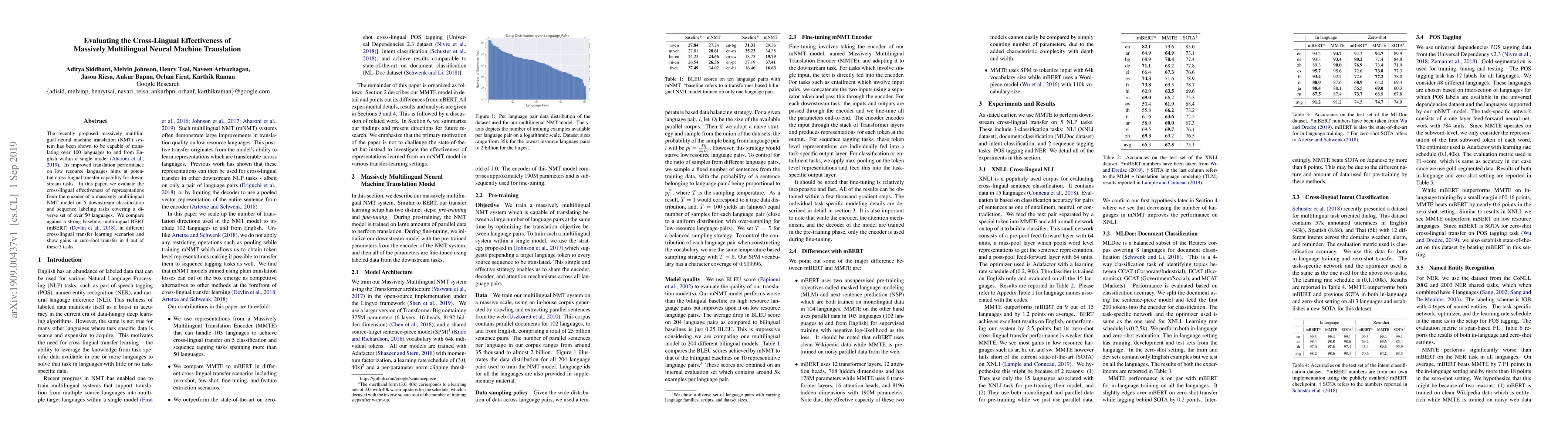 This paper evaluates the cross-lingual effectiveness of a massively multilingual neural machine translation model on various downstream tasks, achieving better zero-shot transfer performance in four out of five tasks compared to the multilingual BERT baseline.