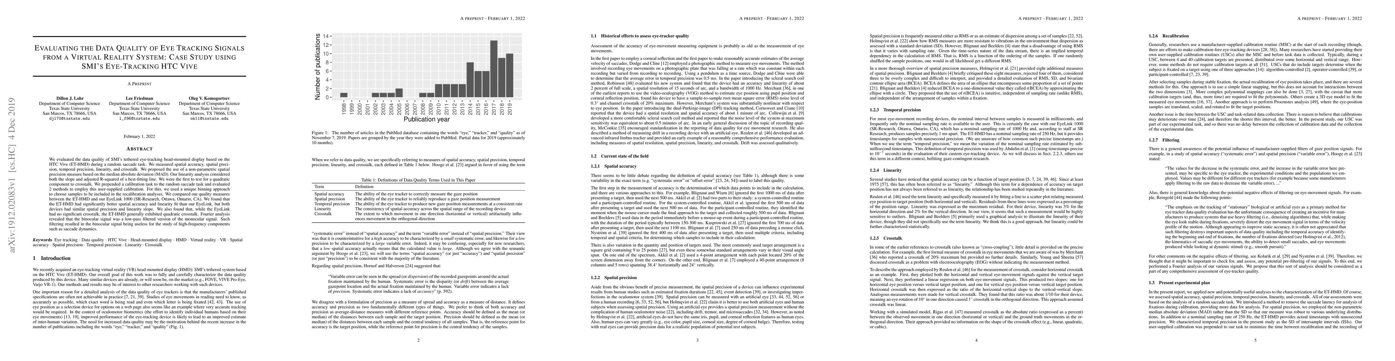 Researchers evaluated data quality of SMI's tethered eye-tracking HTC Vive, finding it had better spatial accuracy and linearity fit than EyeLink 1000, but exhibited quadratic crosstalk that filtered out high-frequency components.