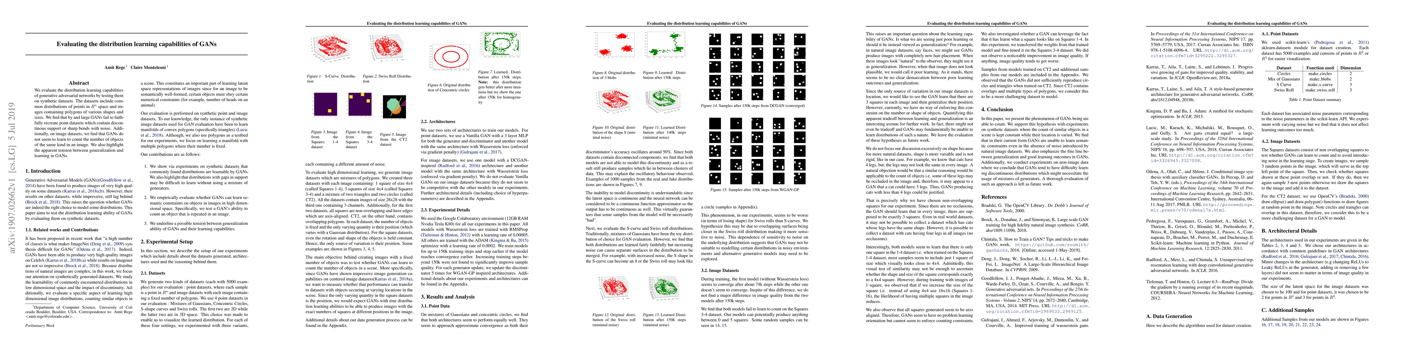 We evaluate the distribution learning capabilities of generative adversarial networks by testing them on synthetic datasets. The datasets include common distributions of points in $R^n$ space and images containing polygons of various shapes and sizes. We find that by and large GANs fail to faithfully recreate point datasets which contain discontinous support or sharp bends with noise. Additionally, on image datasets, we find that GANs do not seem to learn to count the number of objects of the same kind in an image. We also highlight the apparent tension between generalization and learning in GANs.