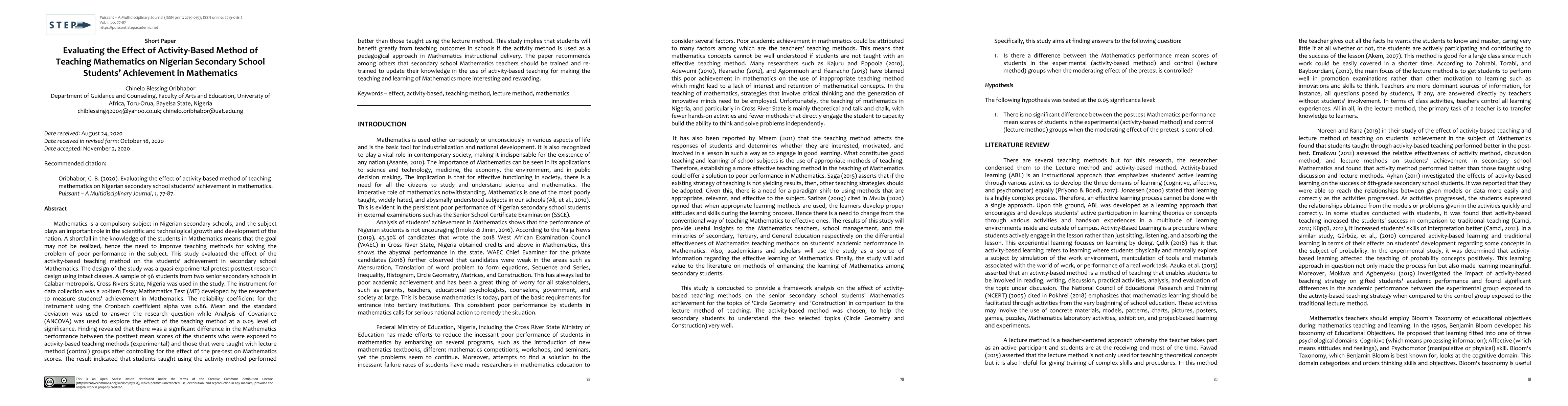 This study assessed the impact of activity-based teaching methods on Nigerian secondary school students' Mathematics achievement, finding significant improvement in the experimental group compared to the control group. Recommendations include training teachers to adopt these methods for better student engagement and performance.