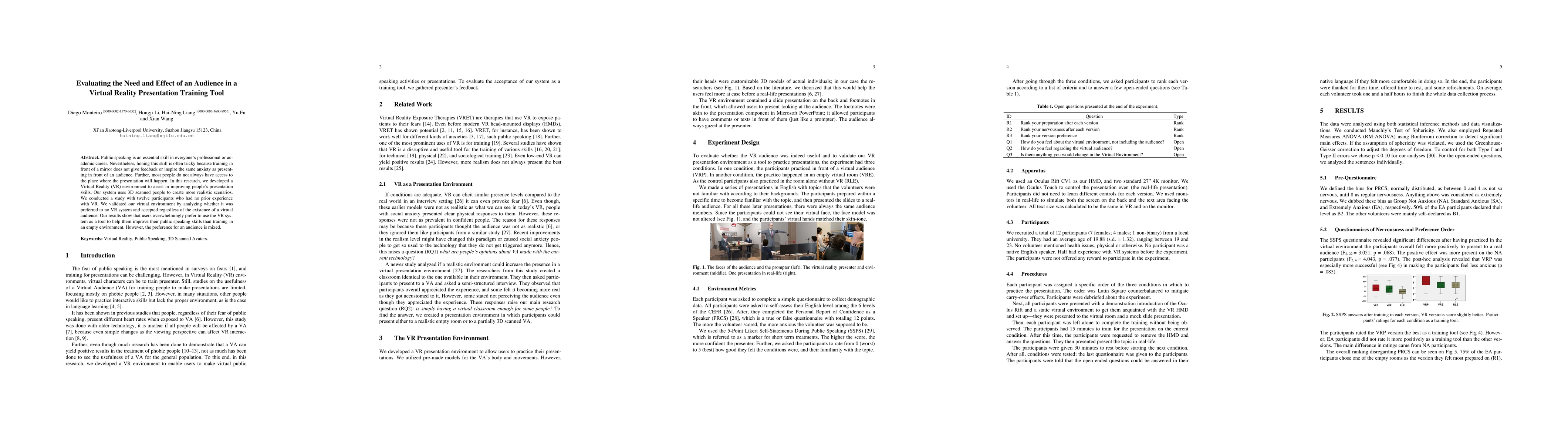 This research developed a VR environment to enhance public speaking skills, finding that participants prefer using it over traditional training methods. However, while the VR system was generally accepted, the preference for a virtual audience was mixed among users.