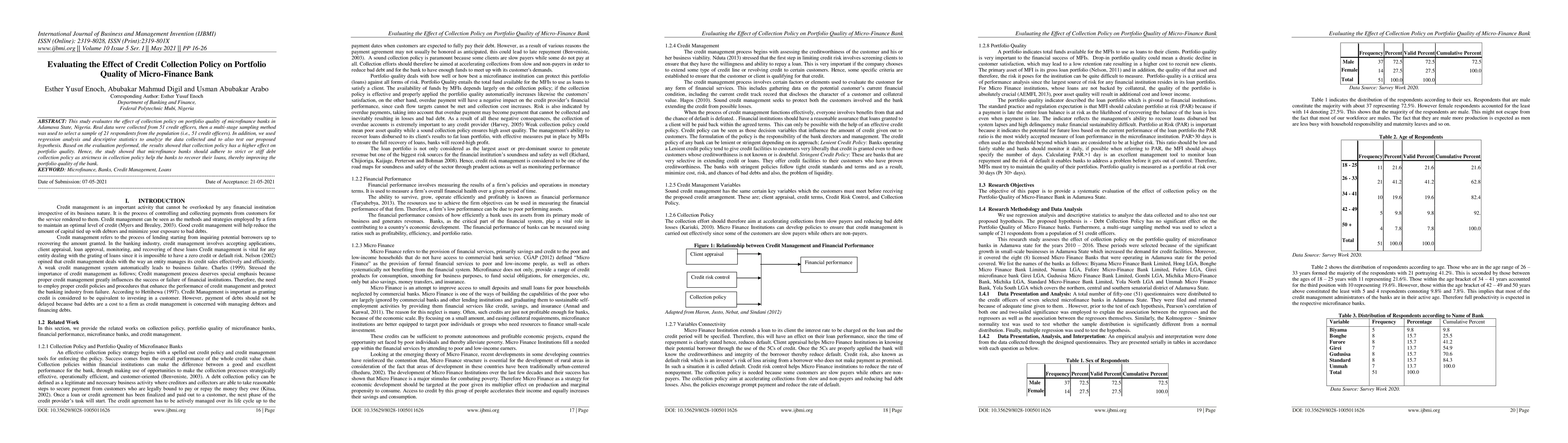 This study evaluates the effect of collection policy on portfolio quality of microfinance banks in Adamawa State, Nigeria. Real data were collected from 51 credit officers, then a multi-stage sampling method was used to select a sample of 21 respondents from the population (i.e., 51 credit officers). In addition, we used regression analysis and descriptive statistics to analyze the data collected and to also test our proposed hypothesis. Based on the evaluation performed, the results showed that collection policy has a higher effect on portfolio quality. Hence, the study showed that microfinance banks should adhere to strict or stiff debt collection policy as strictness in collection policy help the banks to recover their loans, thereby improving the portfolio quality of the bank.