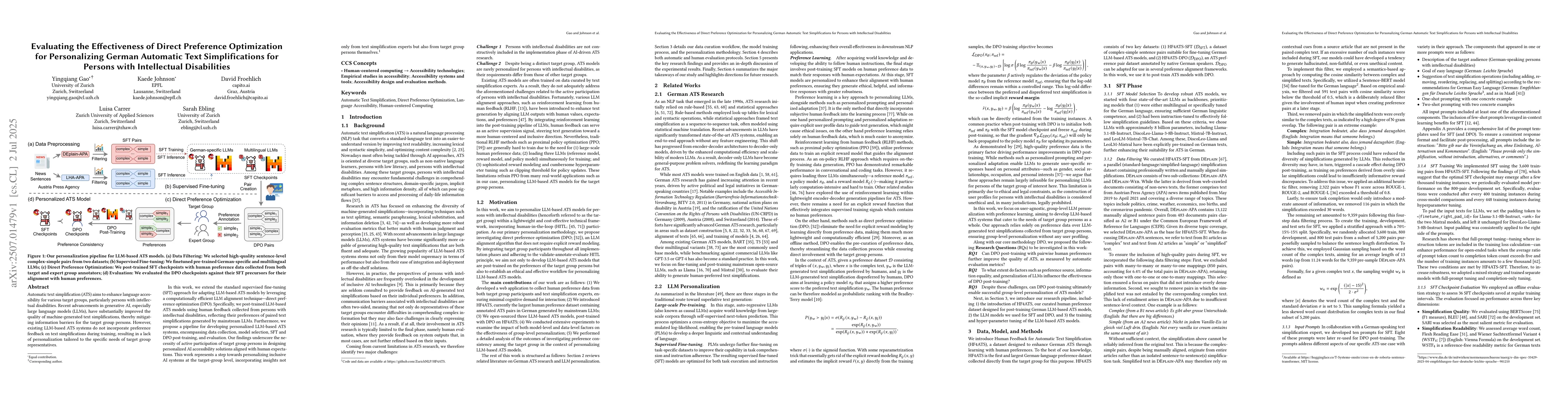 This research introduces Direct Preference Optimization (DPO) to personalize automatic text simplification (ATS) for individuals with intellectual disabilities, enhancing accessibility through human feedback integration. Findings emphasize the importance of target group participation in AI design for tailored solutions.