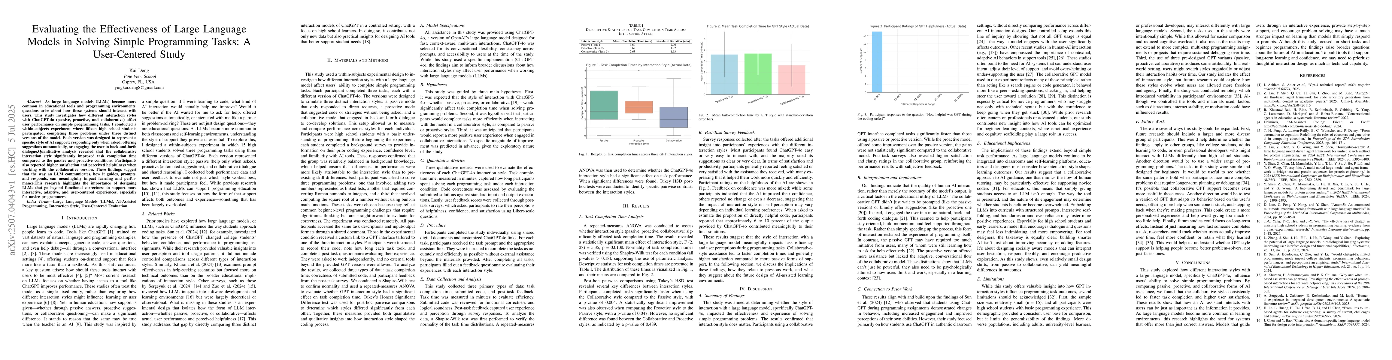 The study demonstrated the effectiveness of a collaborative interaction style with large language models in improving task completion time and user satisfaction for simple programming tasks.